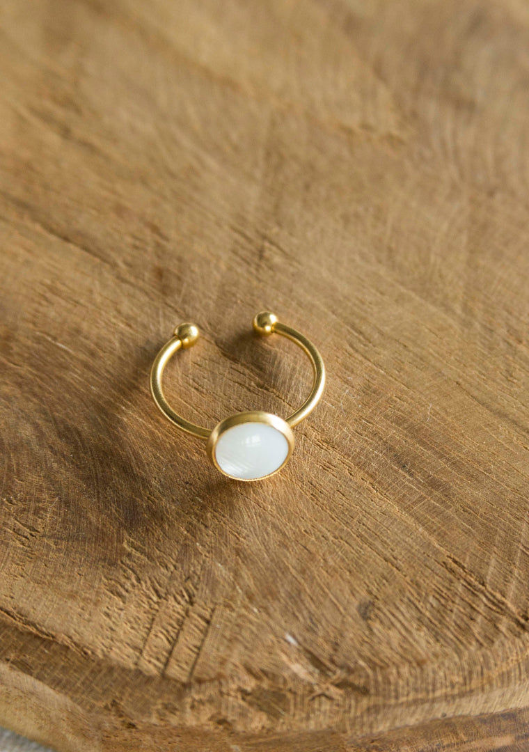 La bague Betty est fabriquée à la main dans mon atelier, Elle est habillée d’une Nacre montée sur un anneau réglable,