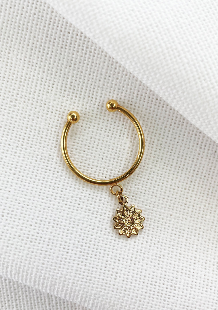 La bague réglable Marguerite est fabriquée à la main dans mon atelier, Elle est habillée d’une pampille ornée d’une petite fleur dorée,