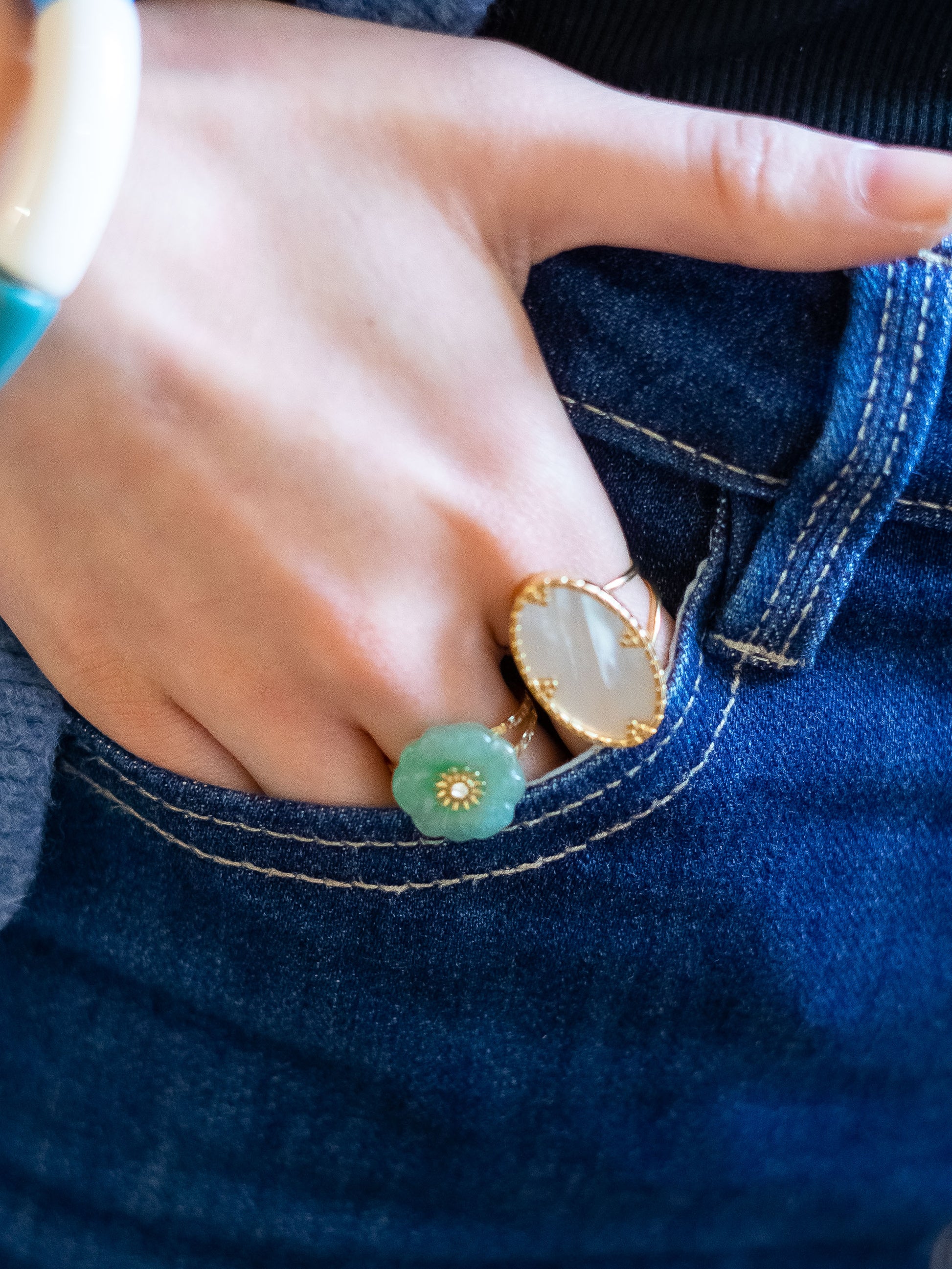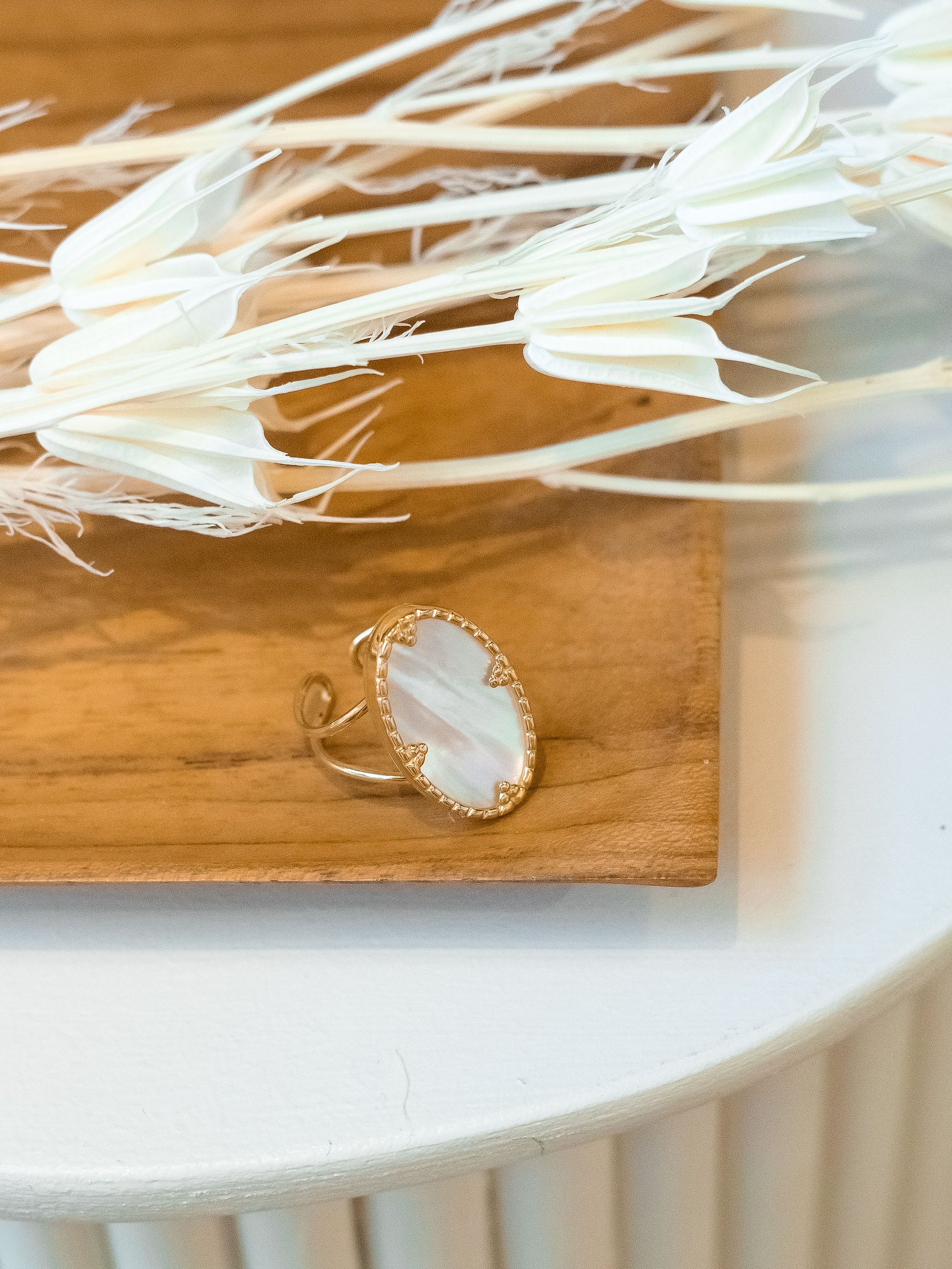 La bague réglable Mél fait partie des quelques bijoux que je ne fabrique pas à l’atelier, Elle est fabriquée par un fournisseur sous-traitant de SIKA, sélectionné pour ces prestations de qualité, Elle est décorée d'une grande Nacre ovale,