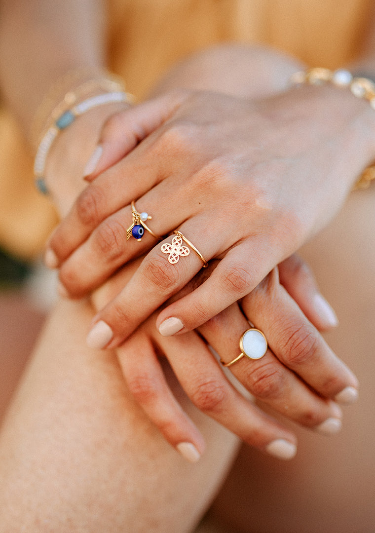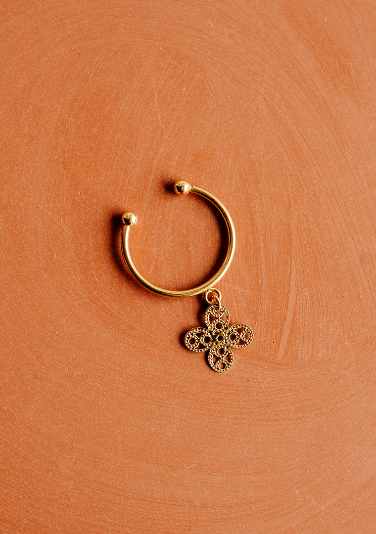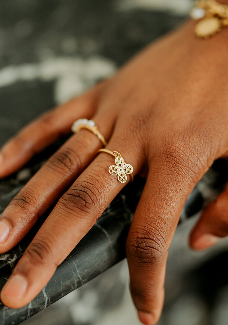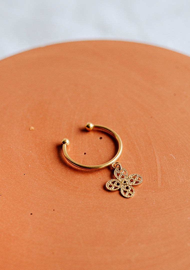 La bague réglable Oran est fabriquée à la main dans mon atelier, Elle est ornée d’une pampille en forme de trêfle,