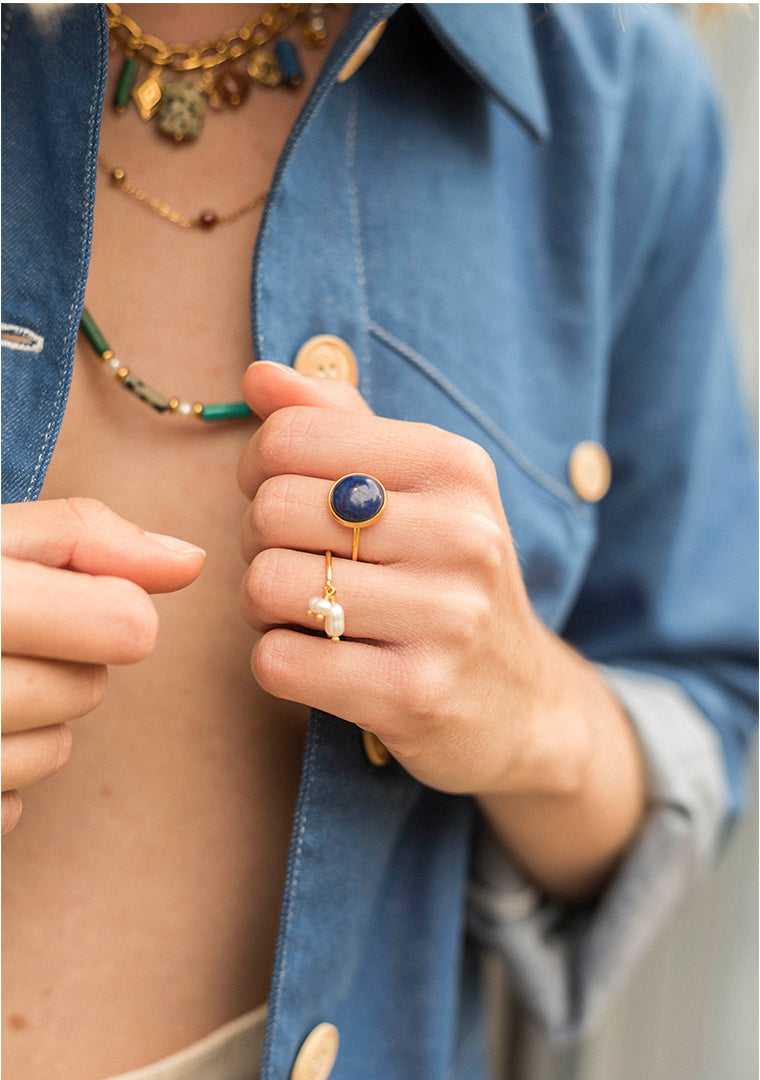 La bague Rosie est fabriquée à la main dans mon atelier, Elle est habillée d’une Lapis-Lazuli montée sur un anneau réglable,