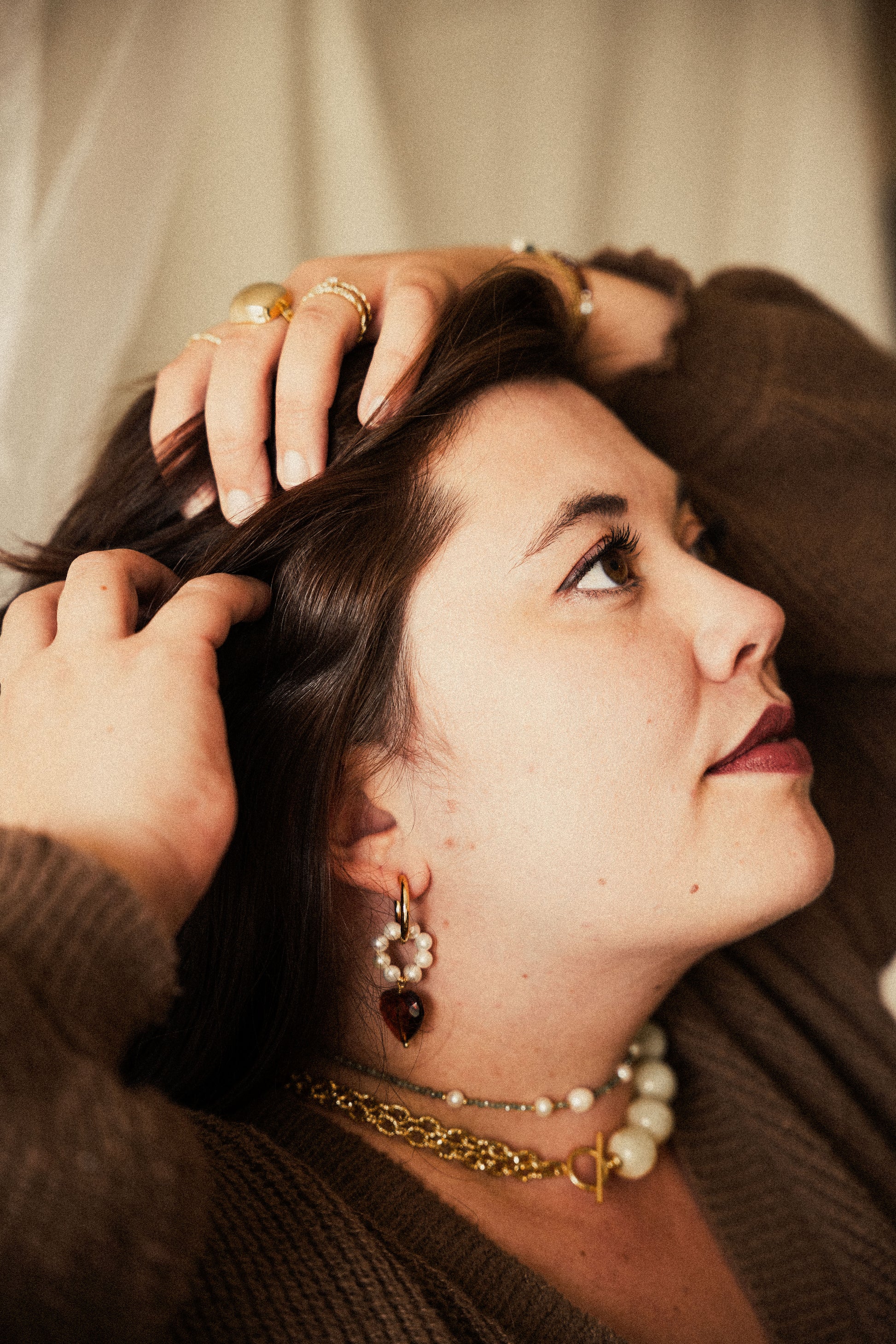 Les boucles Abel sont fabriquées à la main dans mon atelier. Elles sont composées d’une créole et d'un pendent amovible, composé de perles d'eau douce et décoré d'un coeur en perle de verre caramel.