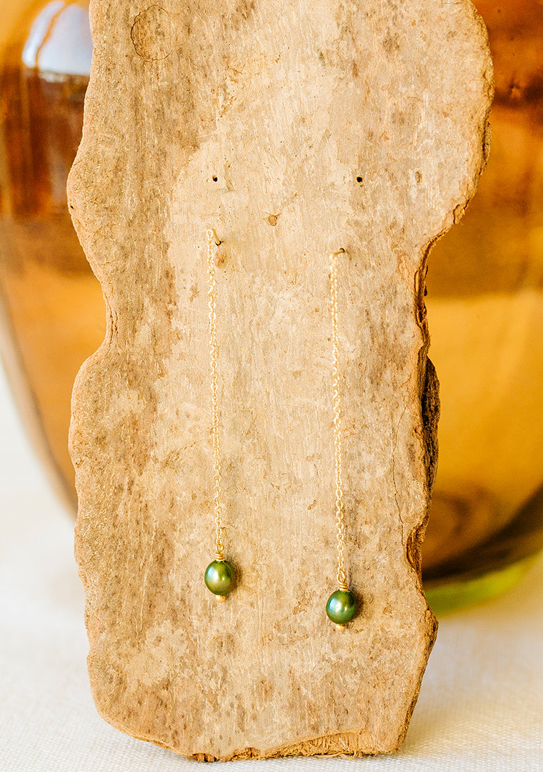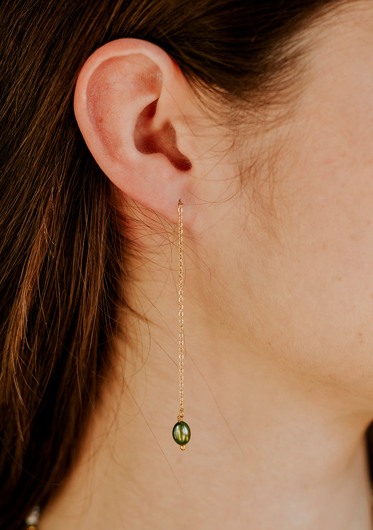 Les boucles d’oreilles Alba sont fabriquées à la main dans mon atelier, Elles sont composées d’une fine chaine ornée de Perles d’eau douce vertes,