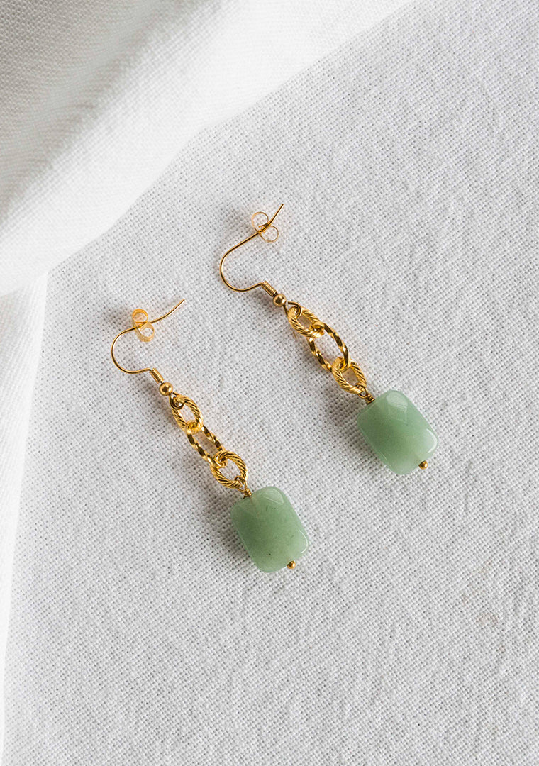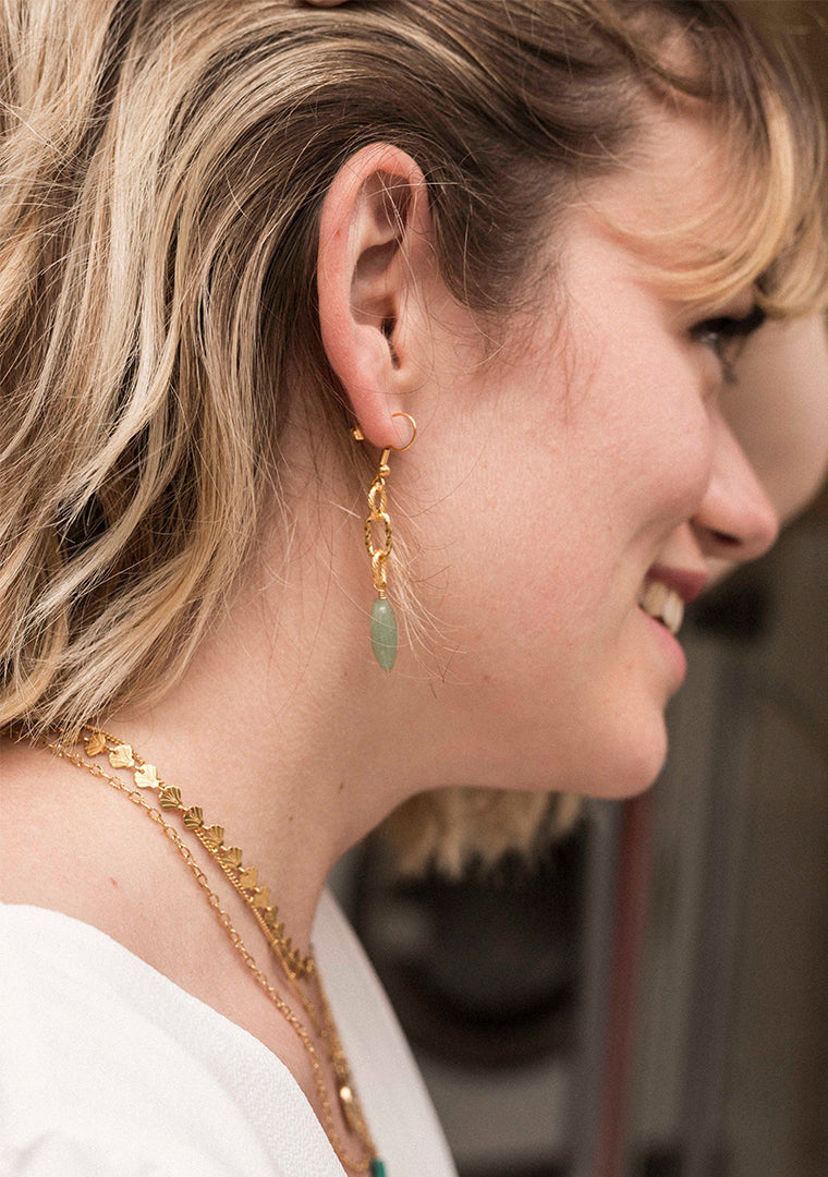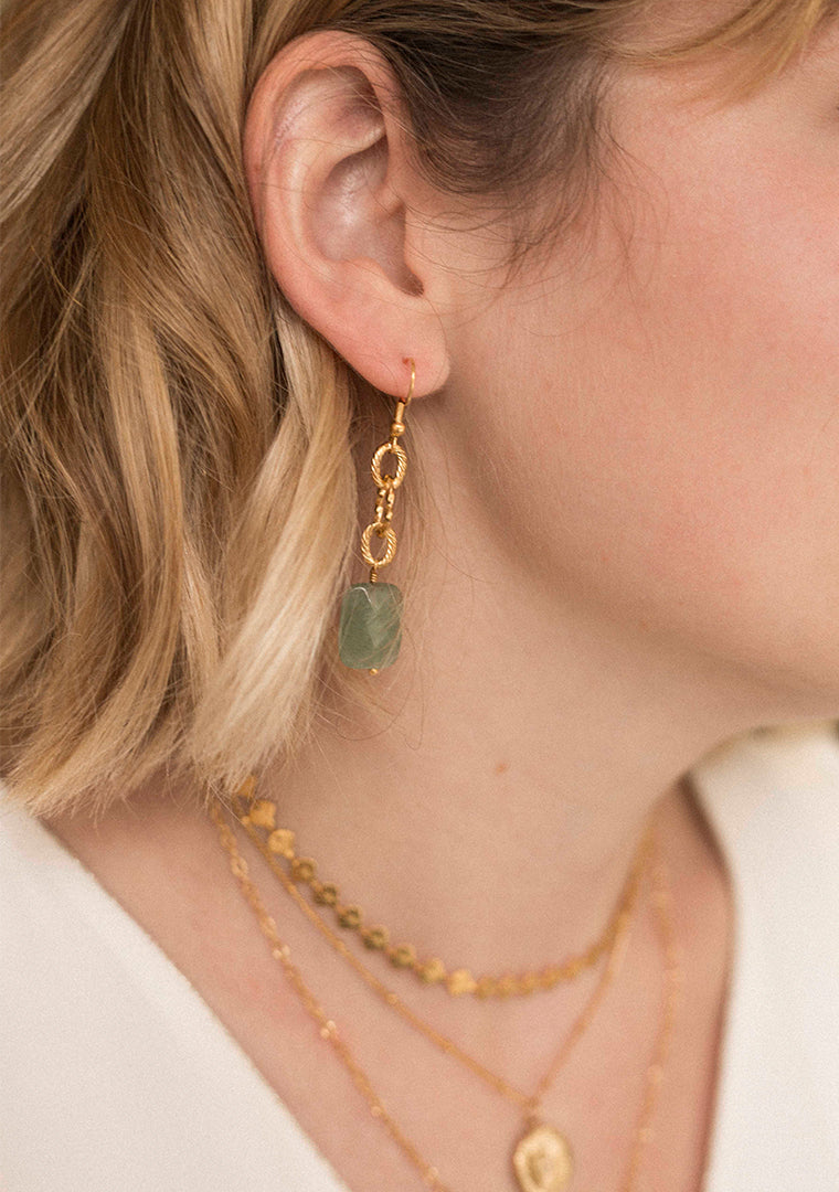 Les boucles Max sont fabriquées à la main dans mon atelier, Elles sont composées d’une chaine aux larges maillons asymétriques habillée par un pendant en Aventurine,