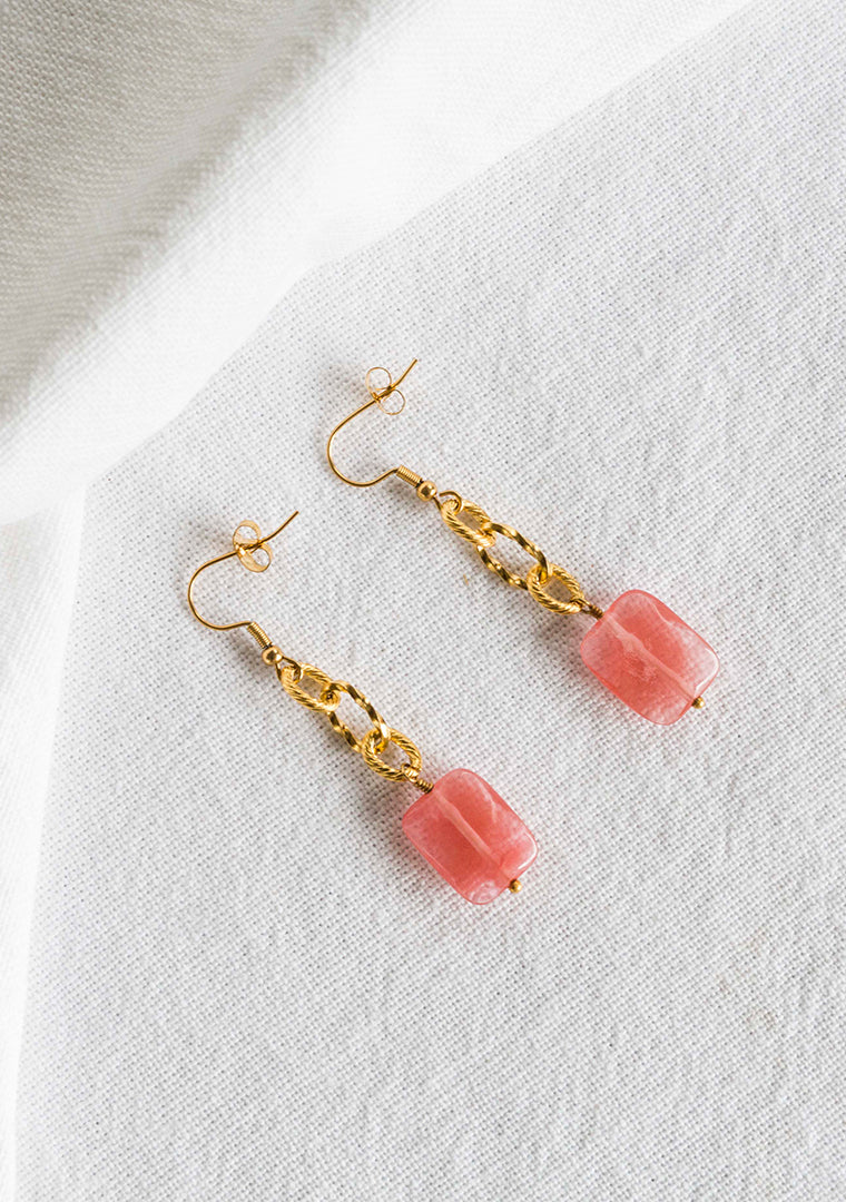 Les boucles Max sont fabriquées à la main dans mon atelier, Elles sont composées d’une chaine aux larges maillons asymétriques habillée par un pendant en Quartz cerise,
