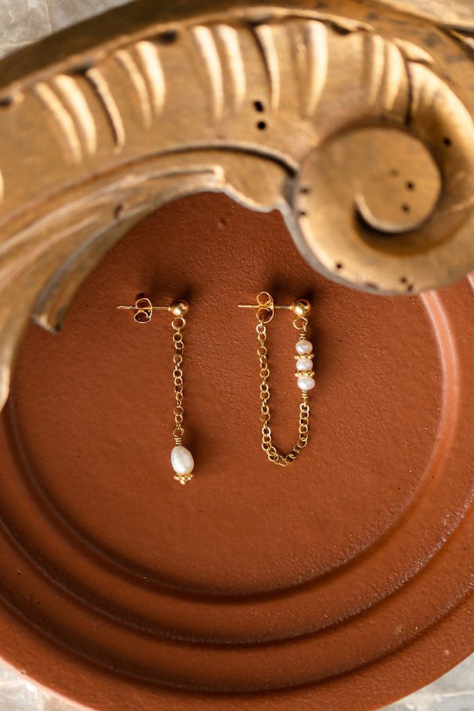 Les boucles asymétriques Éléia sont fabriquées à la main dans mon atelier, Elles sont composées d’une puce ronde décorée d’une chaîne aux maillons ovales, de perles dorées et de perles d’eau douce,