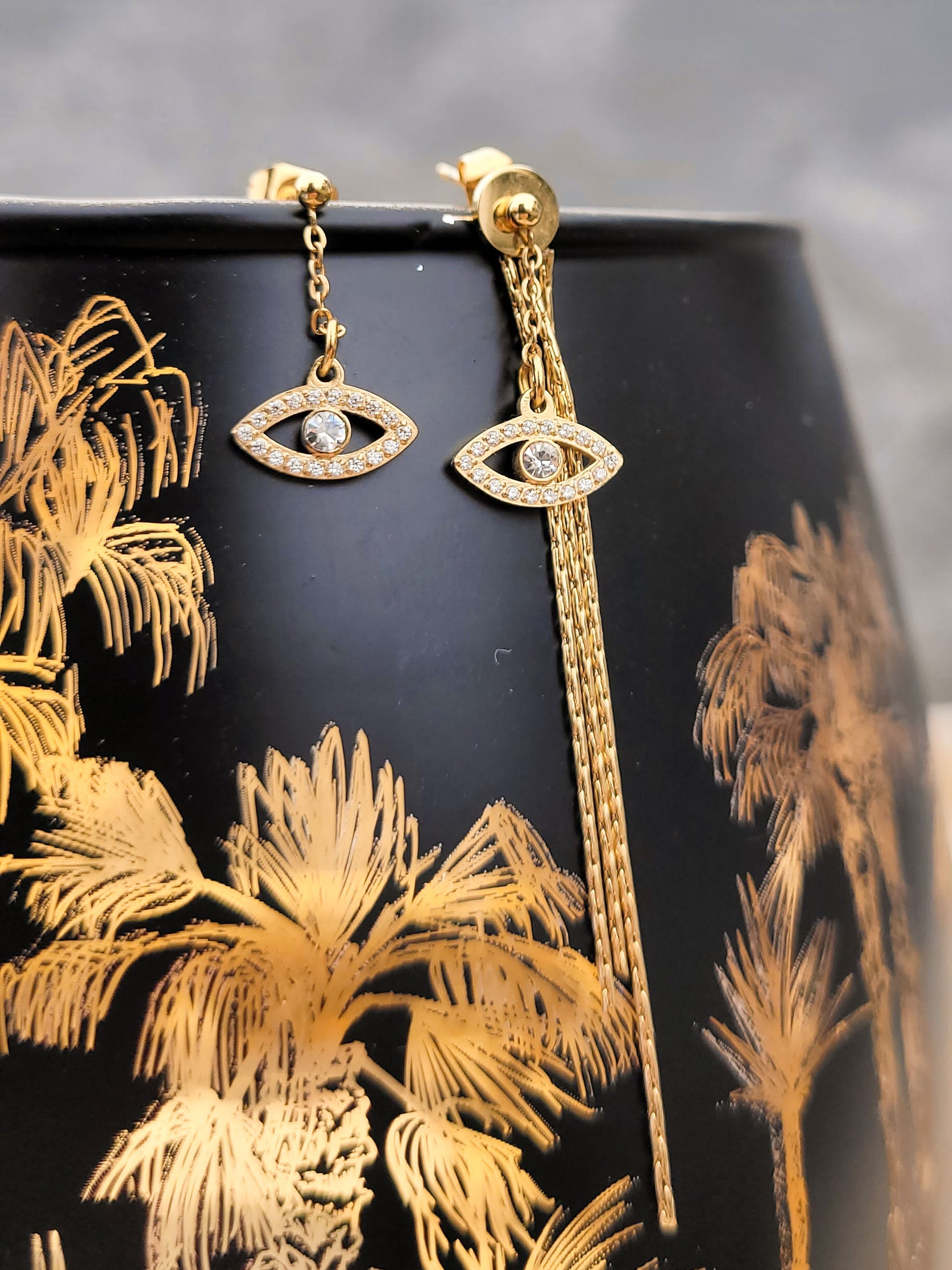 - Une composée d’une fine chaine et d’un pendentif en forme d’oeil ornée de strass