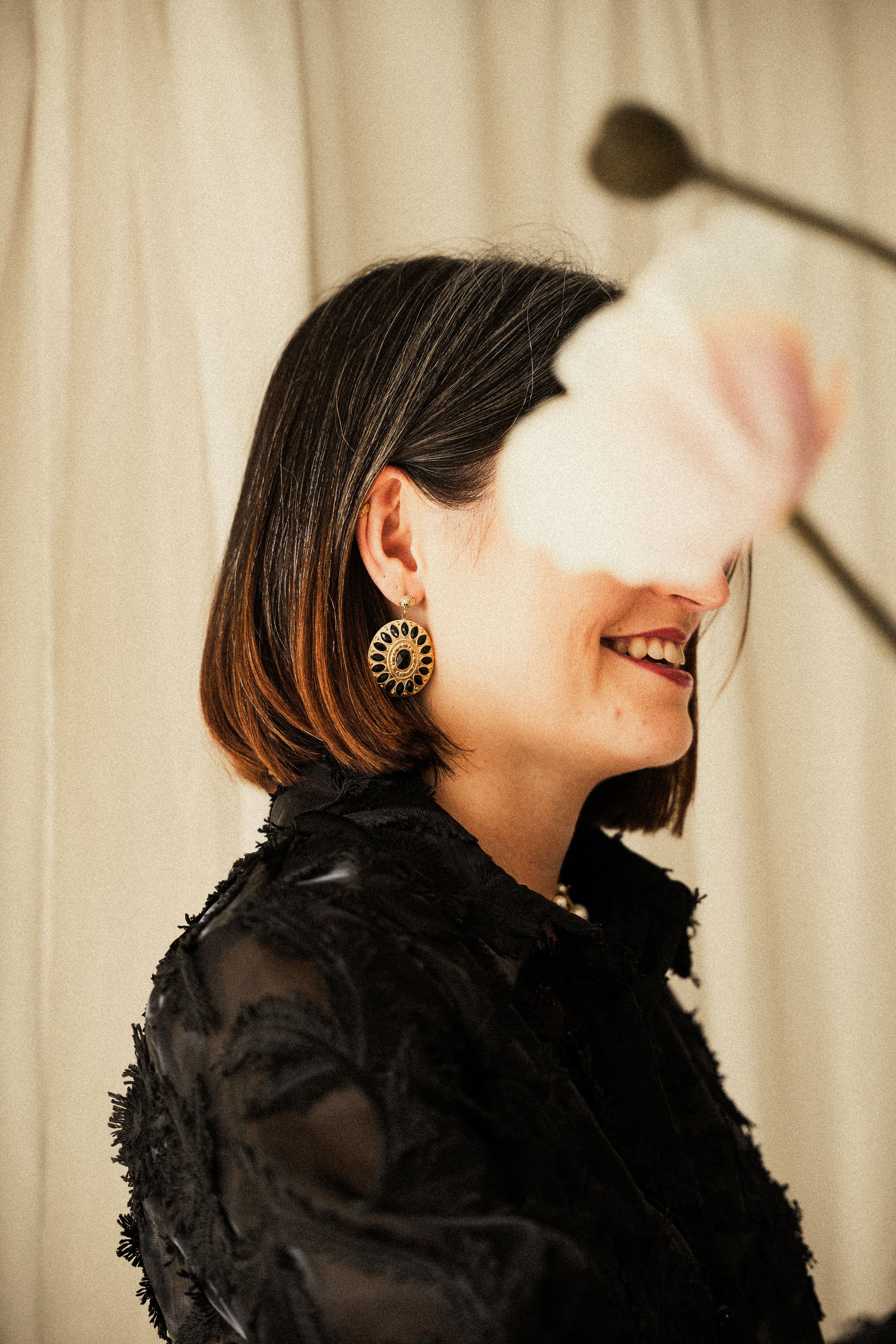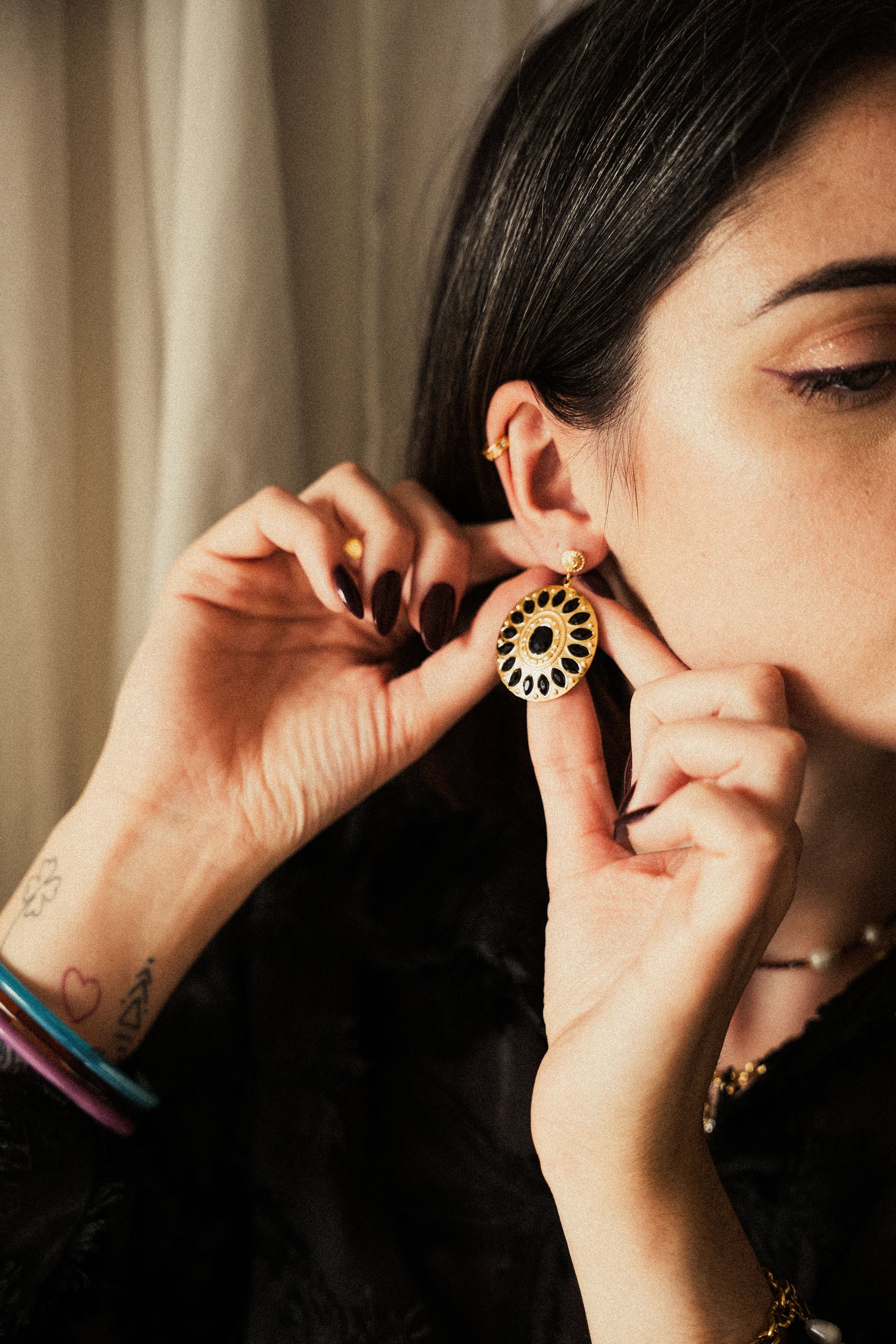 Les boucles Gipsy sont fabriquées à la main dans mon atelier. Elles sont composées d’une puce ronde décorée d’un pendant en en relief et orné de strass noir.