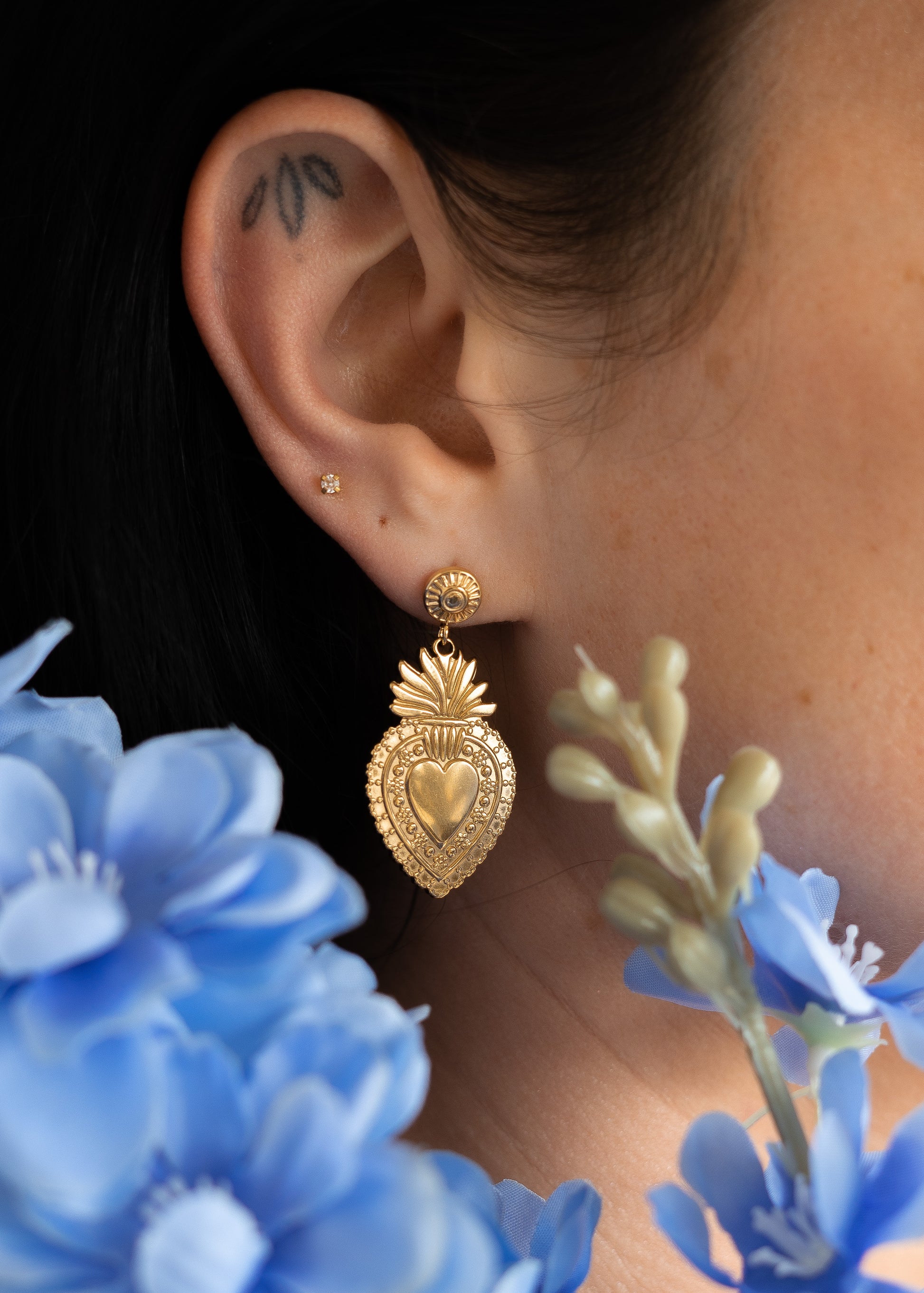 Les boucles Hope sont fabriquées à la main dans mon atelier, Elles sont composées d'une puce striée, sur laquelle est monté un pendentif en forme d'ex voto,