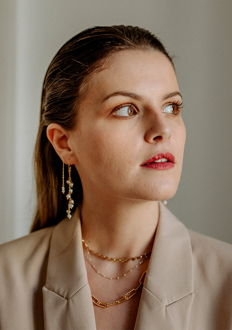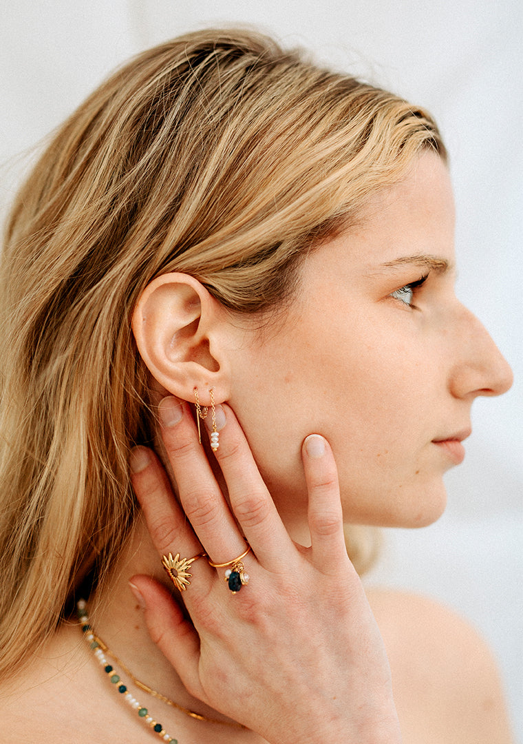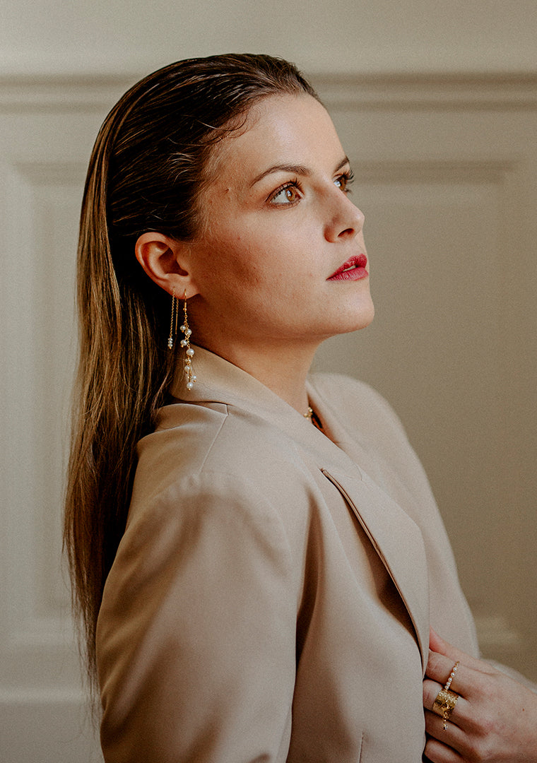 Les boucles Lya sont fabriquées à la main dans mon atelier, Elles sont composées d’une fine chaine ornée de Perles d’eau douce qui vous permet de les porter de différentes façons,