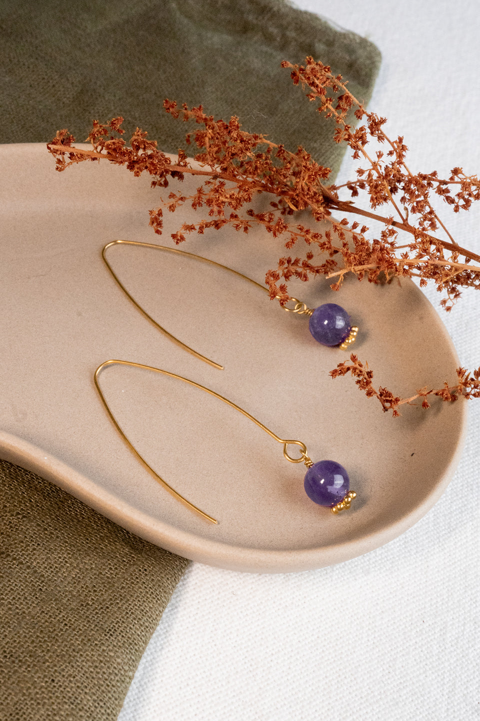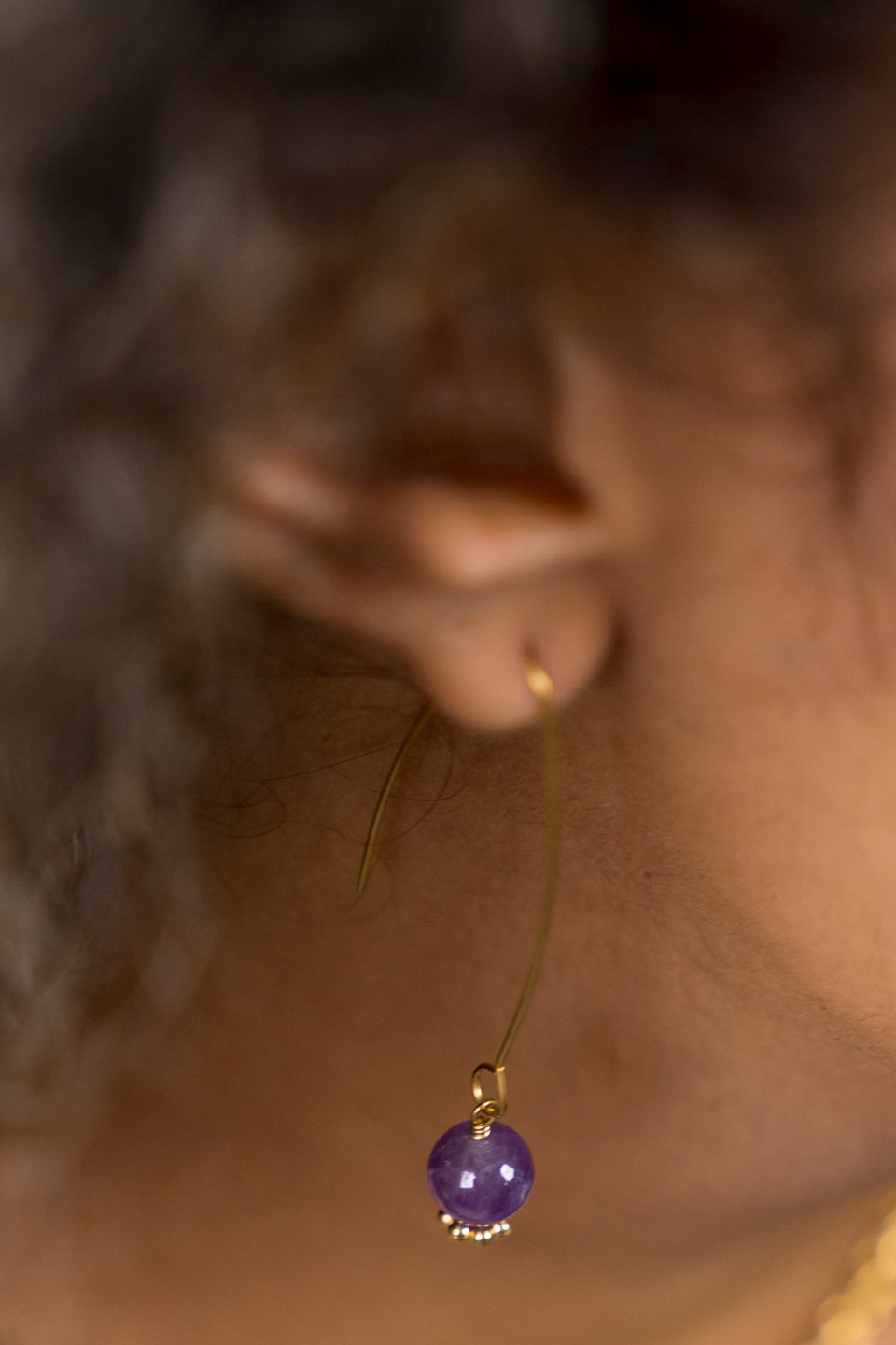 Les boucles Osiris sont fabriquées à la main dans mon atelier, Elles sont composées d’un support épingle décoré d’une Améthyste et d’une perle dorée,