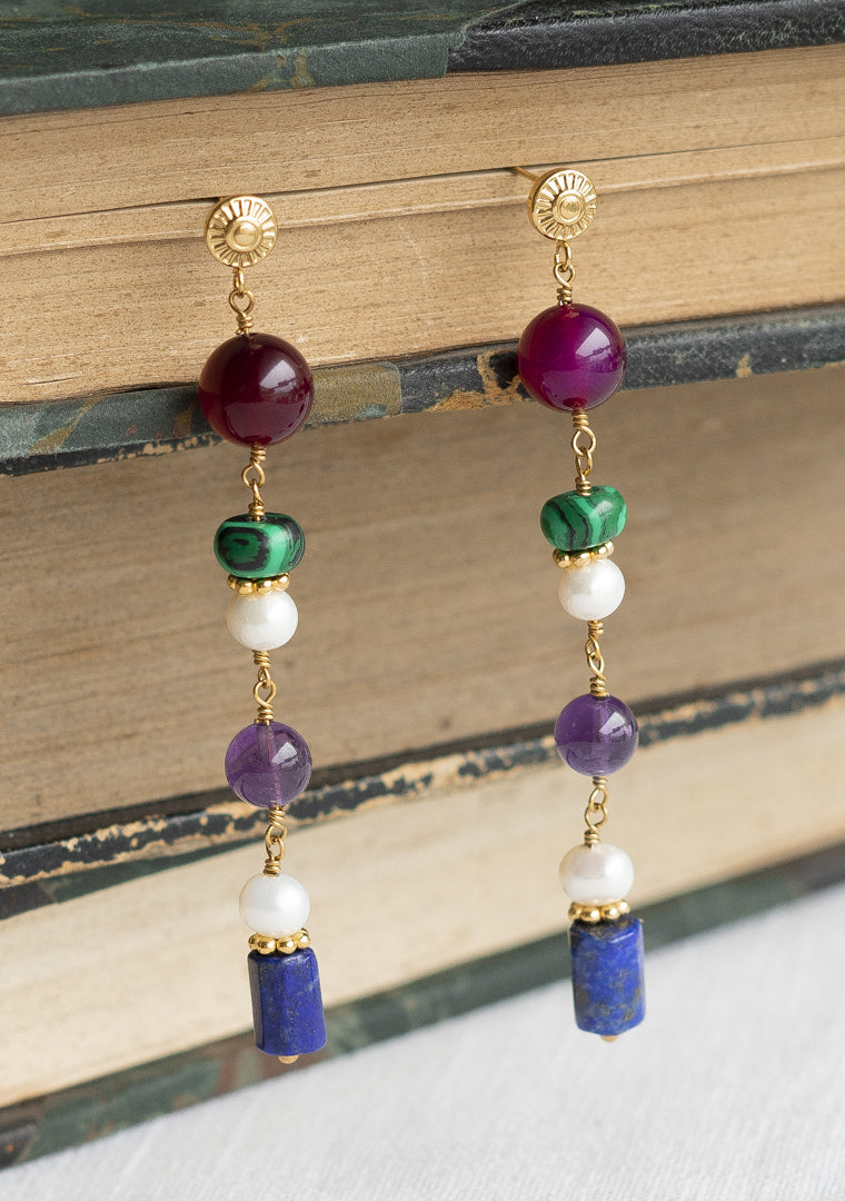 Les boucles Paloma sont fabriquées à la main dans mon atelier, Elles sont composée d’une puce d’oreille décorée de pierres semi-précieuses et de perles dorées,