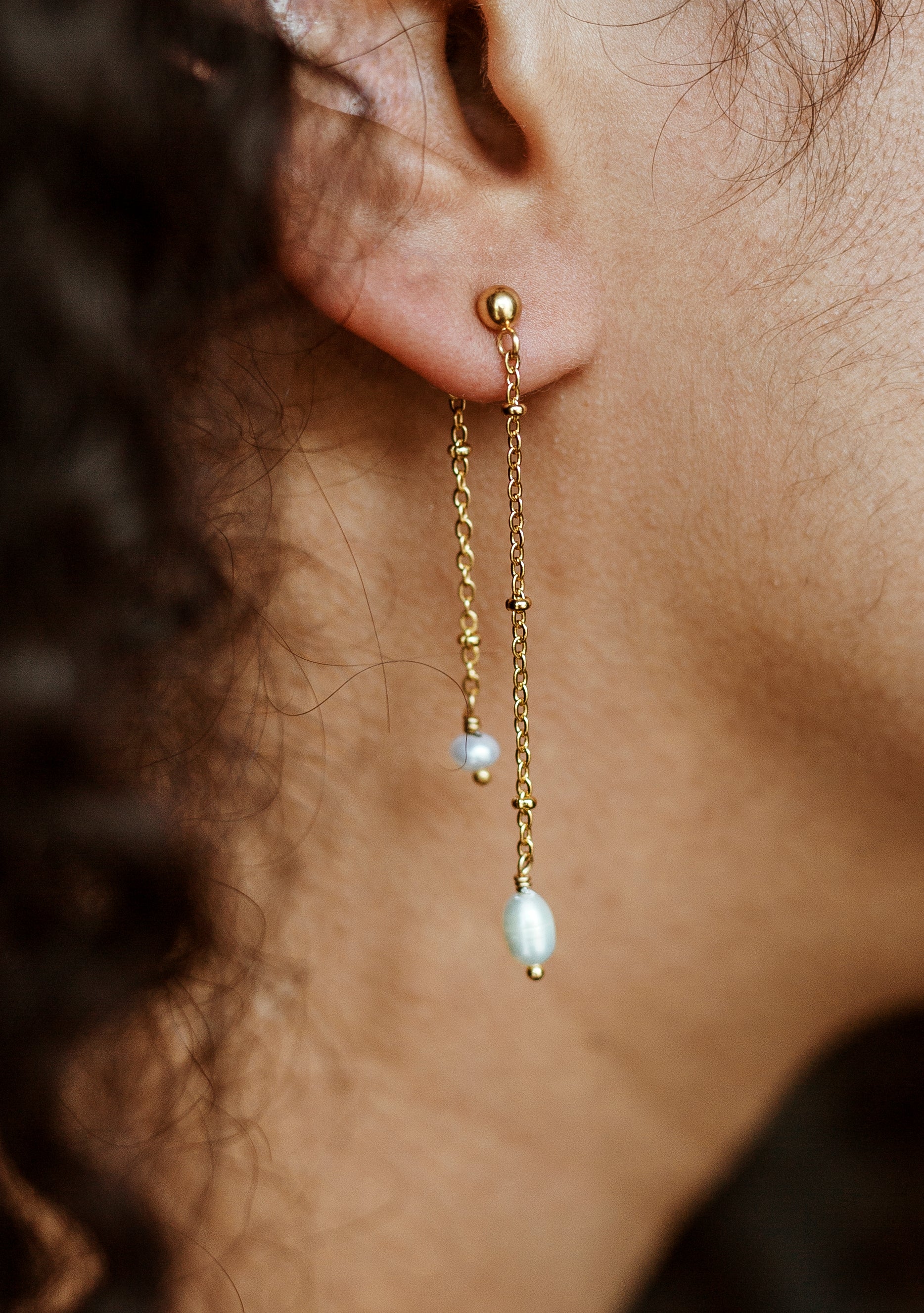 Les boucles Tisha sont fabriquées à la main dans mon atelier, Elles sont composées d’une puce d’oreille décorée d’une fine chaine et de perles d’eau douce, Le fermoir est également orné de la même façon avec une chaine plus courte, Les boucles Tisha sont également vendues avec un fermoir simple,