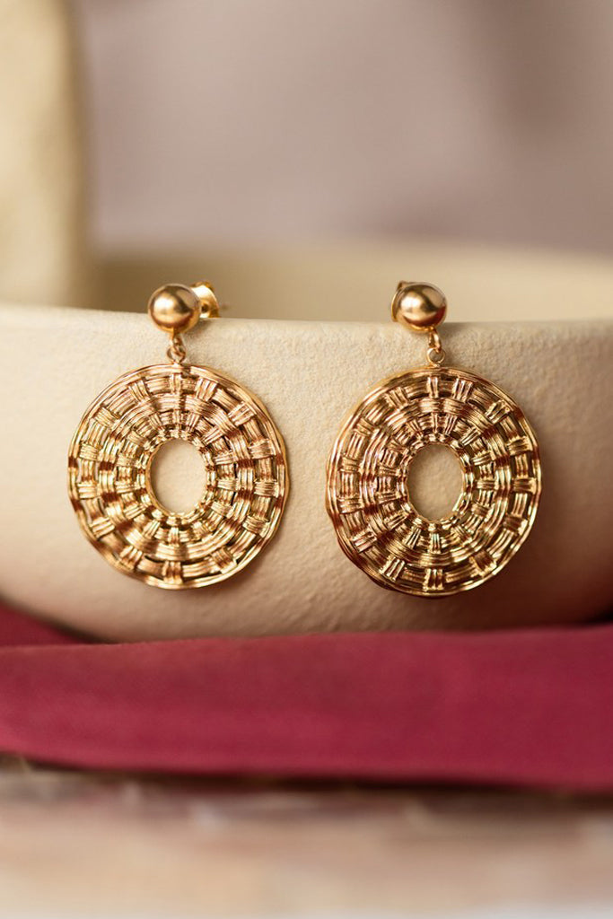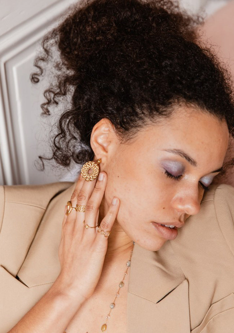 Les boucles Victoria sont fabriquées à la main dans mon atelier, Elles sont composées de puces rondes décorées d’une estampe ovale qui donne l’illusion de fils de métal tressés,