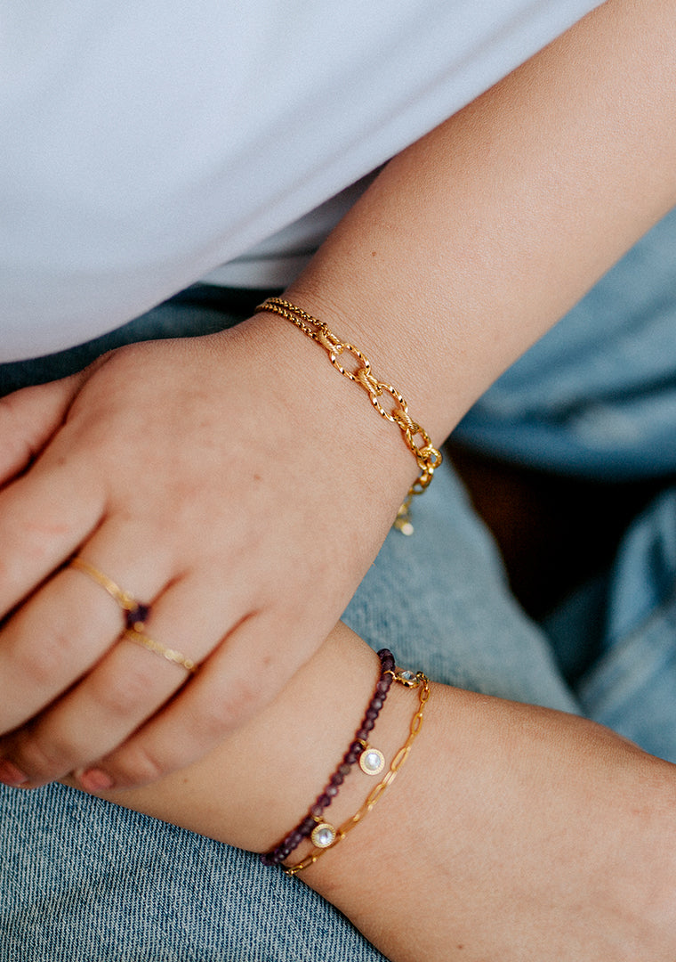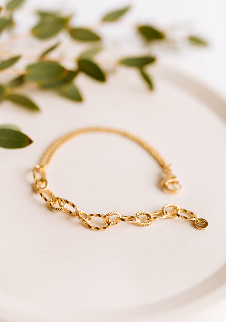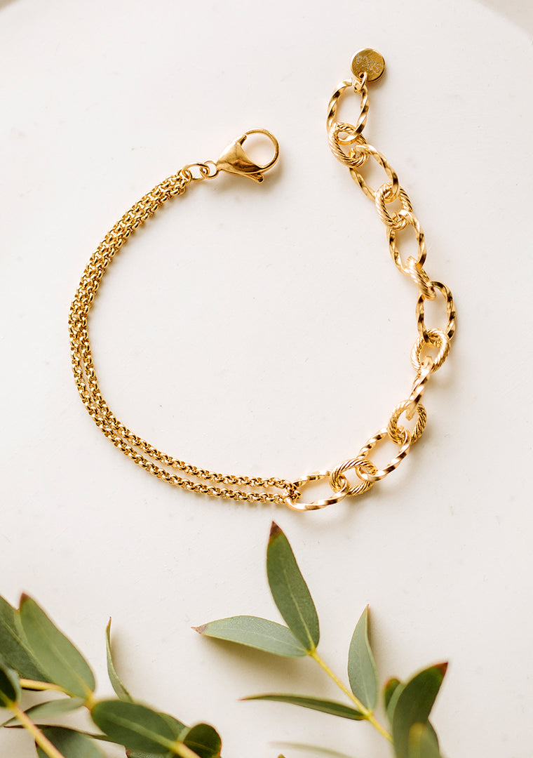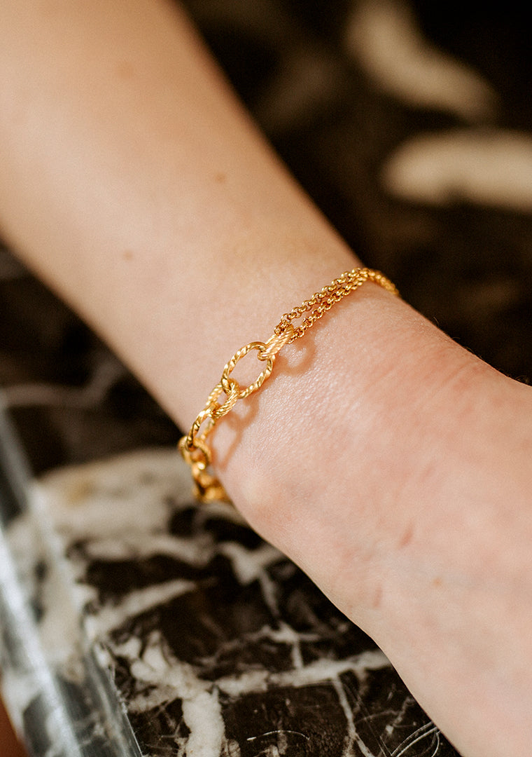 Le bracelet Alicia est fabriqué à la main dans mon atelier, Il est composé d’une chaine aux maillons asymétriques, doublées d‘une chaine aux maillons ronds et d’un fermoir bâton,