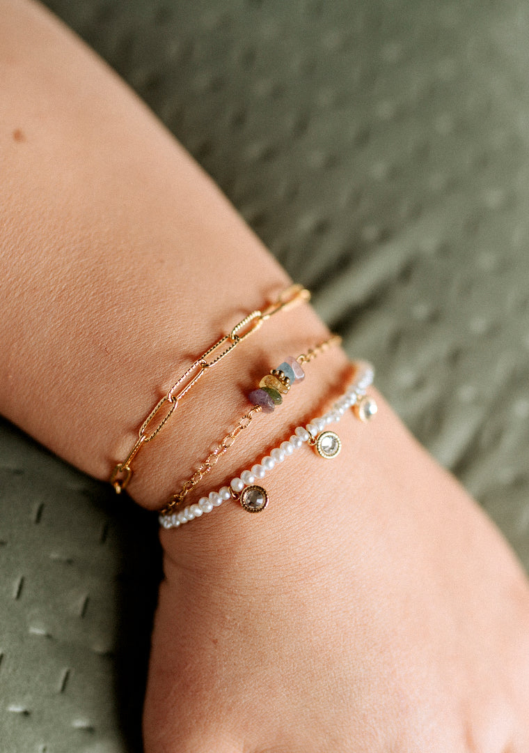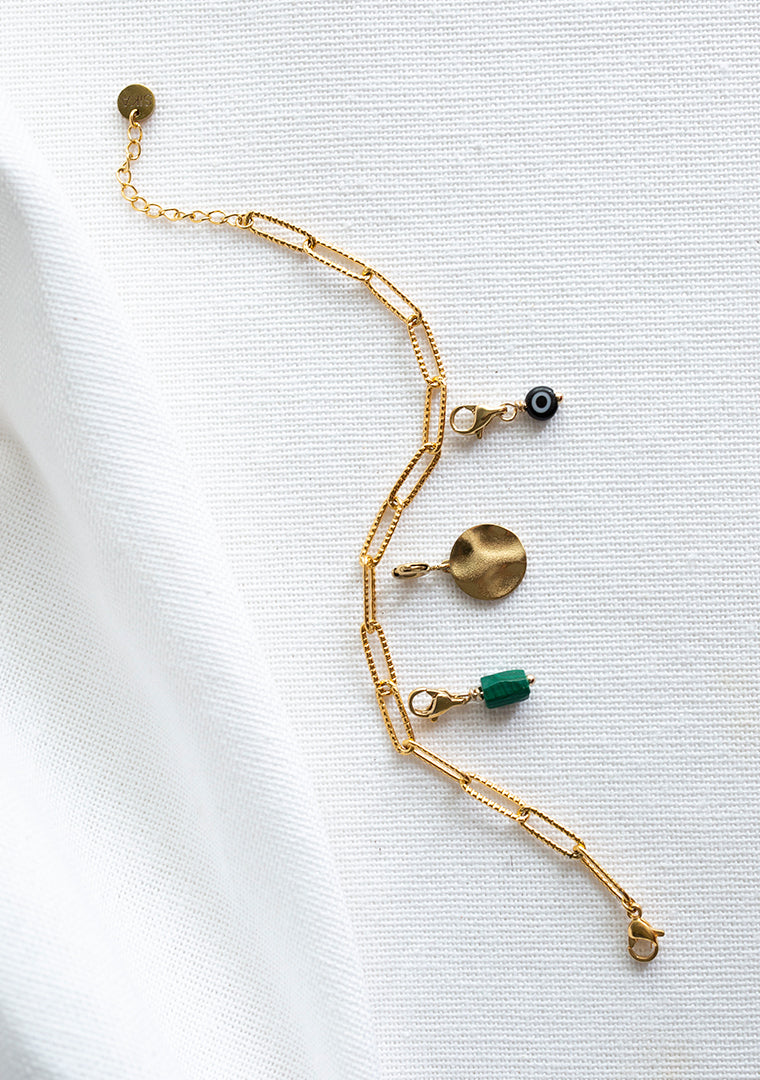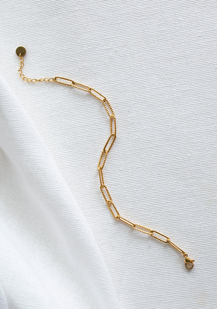 Le bracelet Aria est fabriqué à la main dans mon atelier, Il est composé d’une chaine aux mailles rectangulaires,