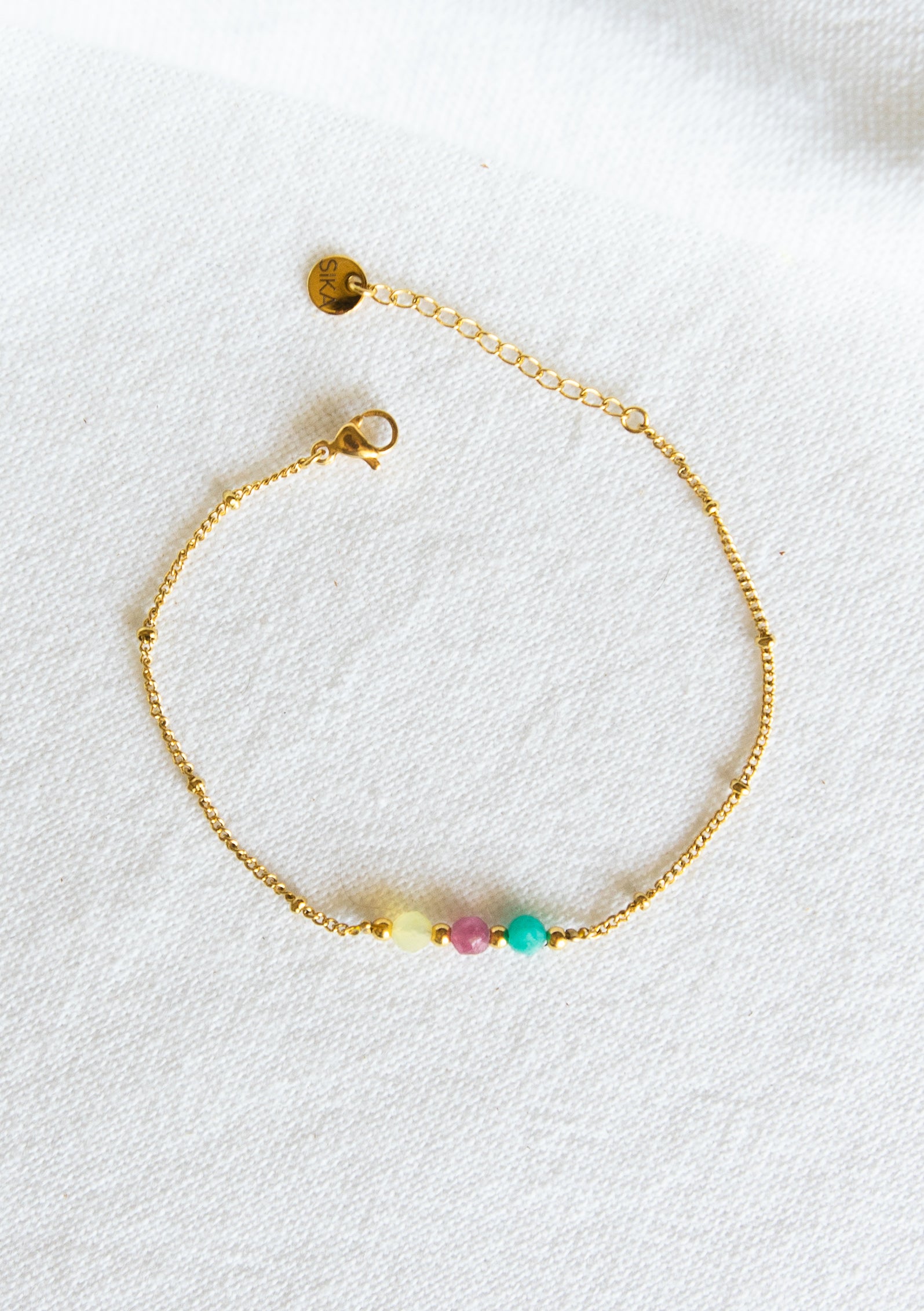 Le bracelet Elsa est fabriqué à la main dans mon atelier, Il est monté sur une fine chaine ornée de petite billes et habillée de quelques pierres semi-précieuses et de perles dorées,