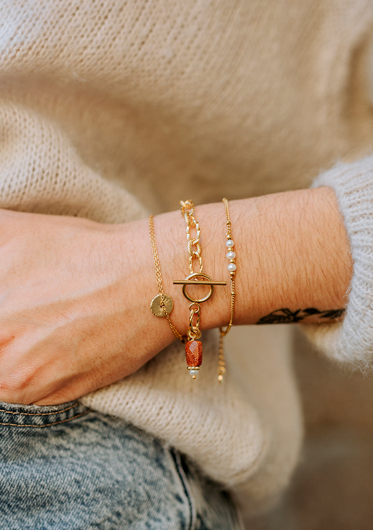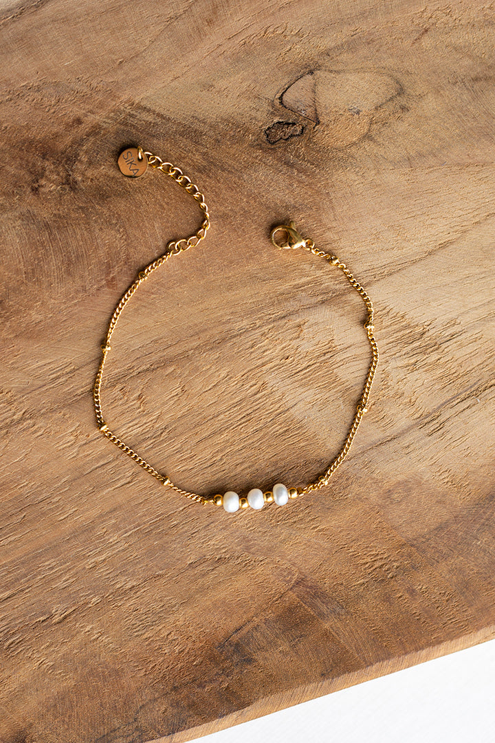 Le bracelet Elsa est fabriqué à la main dans mon atelier, Il est monté sur une fine chaine ornée de petite billes et habillée de quelques perles d’eau douces et de perles dorées,