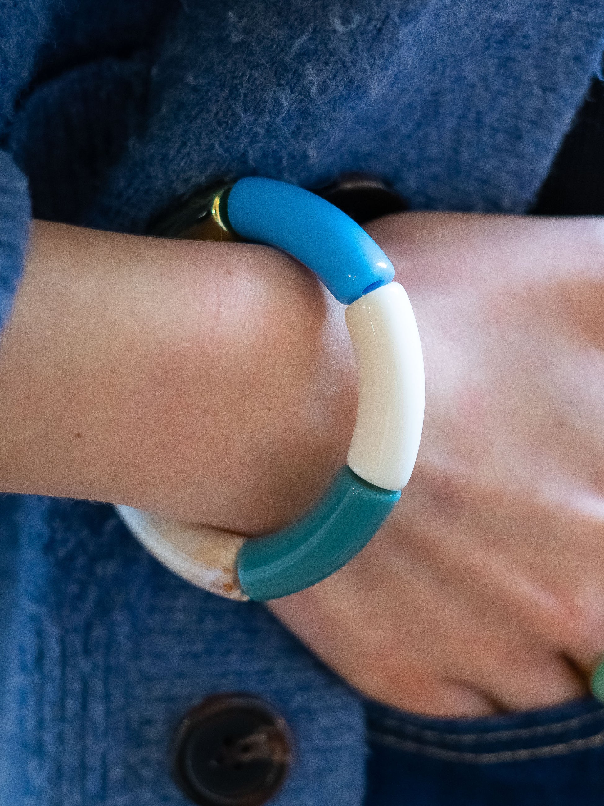 Le bracelet Enora est fabriqué à la main dans mon atelier, Il est composé de perles en résine colorées montées sur un élastique,