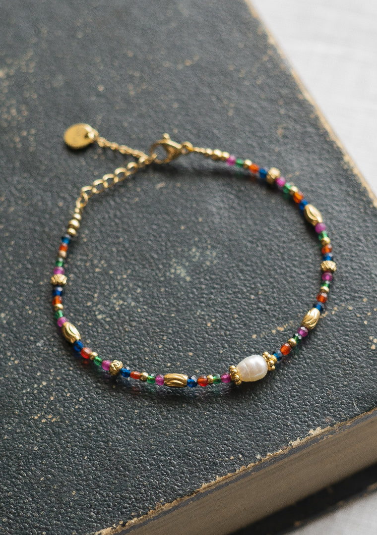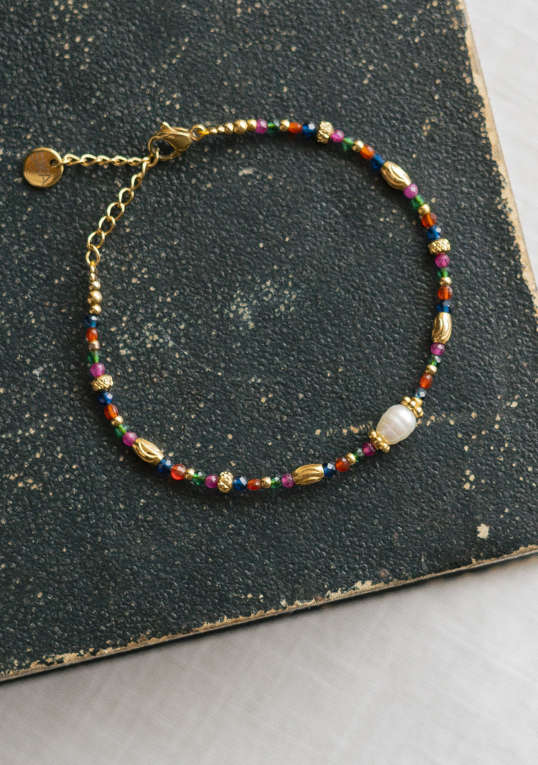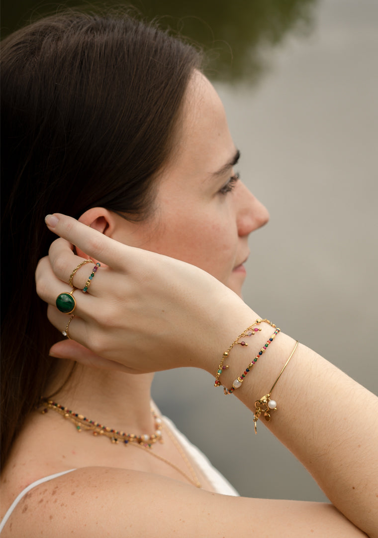 Le bracelet Gaïa est fabriqué à la main dans mon atelier, Il est composé d’une multitude de pierres semi-précieuses multicolores, de perle d’eau douce et de perles dorées,