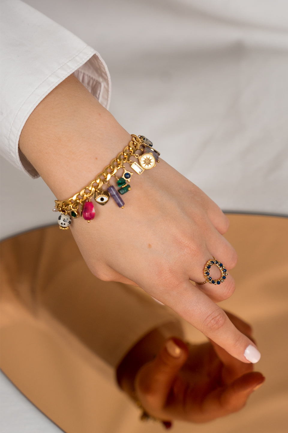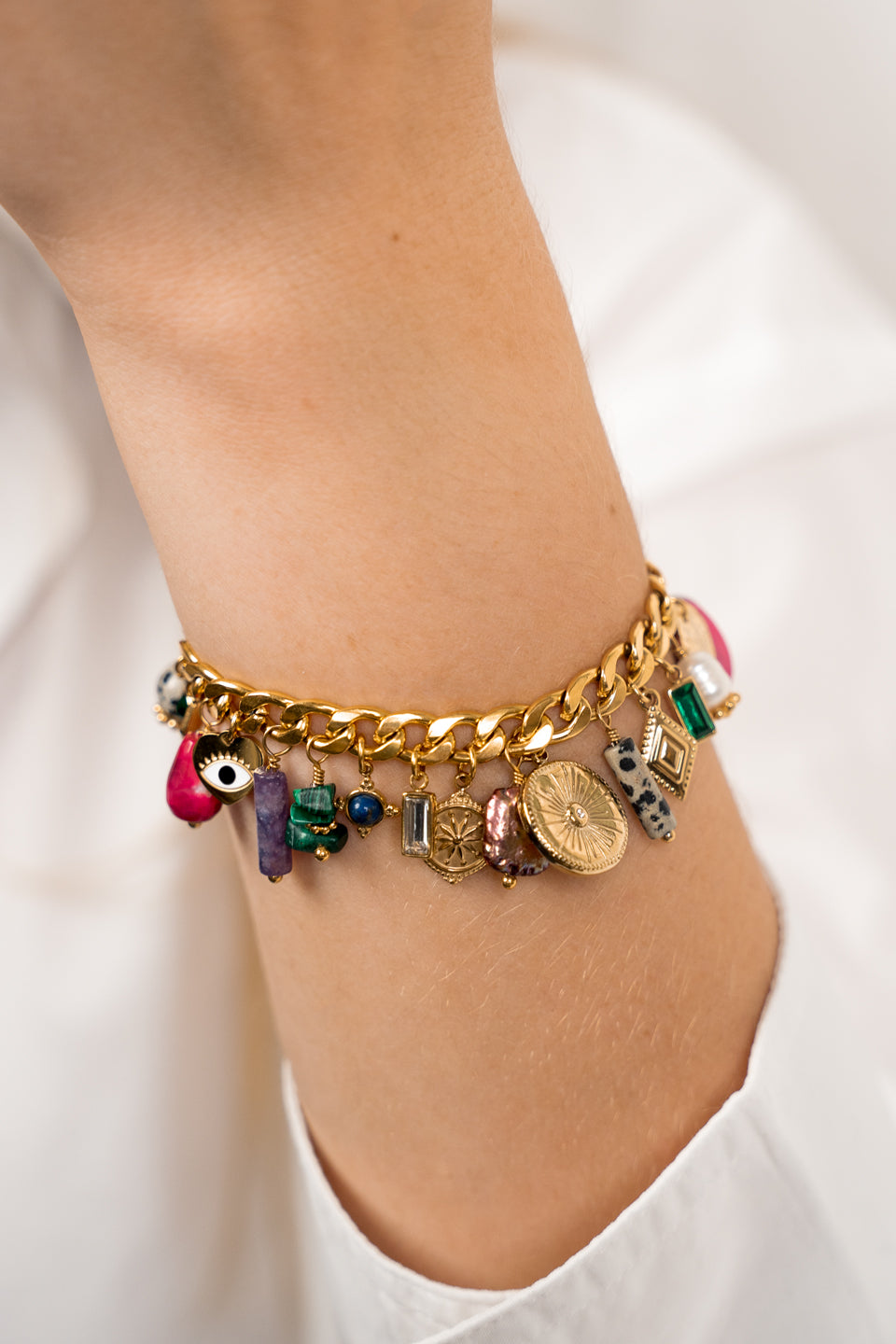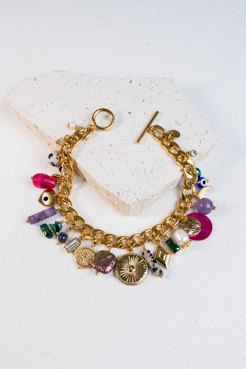 Le bracelet Horia est fabriqué à la main dans mon atelier, Il est composé d’une chaine gourmette, décorée d’un fermoir bâton et d’une multitude de pampilles dorées et en pierre semi-précieuses,