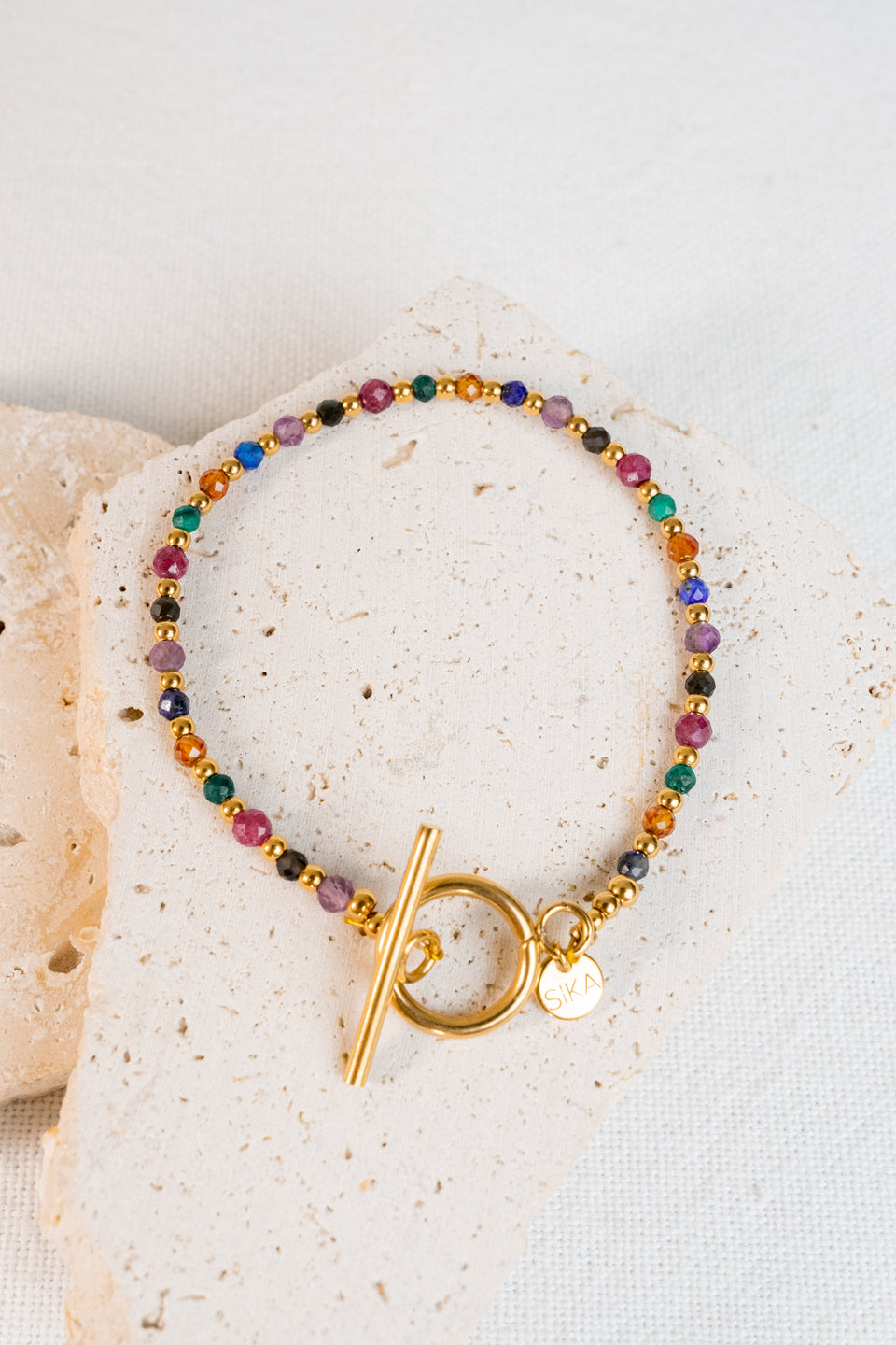 Le bracelet Indira est fabriquée à la main dans mon atelier, Il est composé de diverses pierres semi-précieuses, de perles dorées et d’un fermoir bâton,