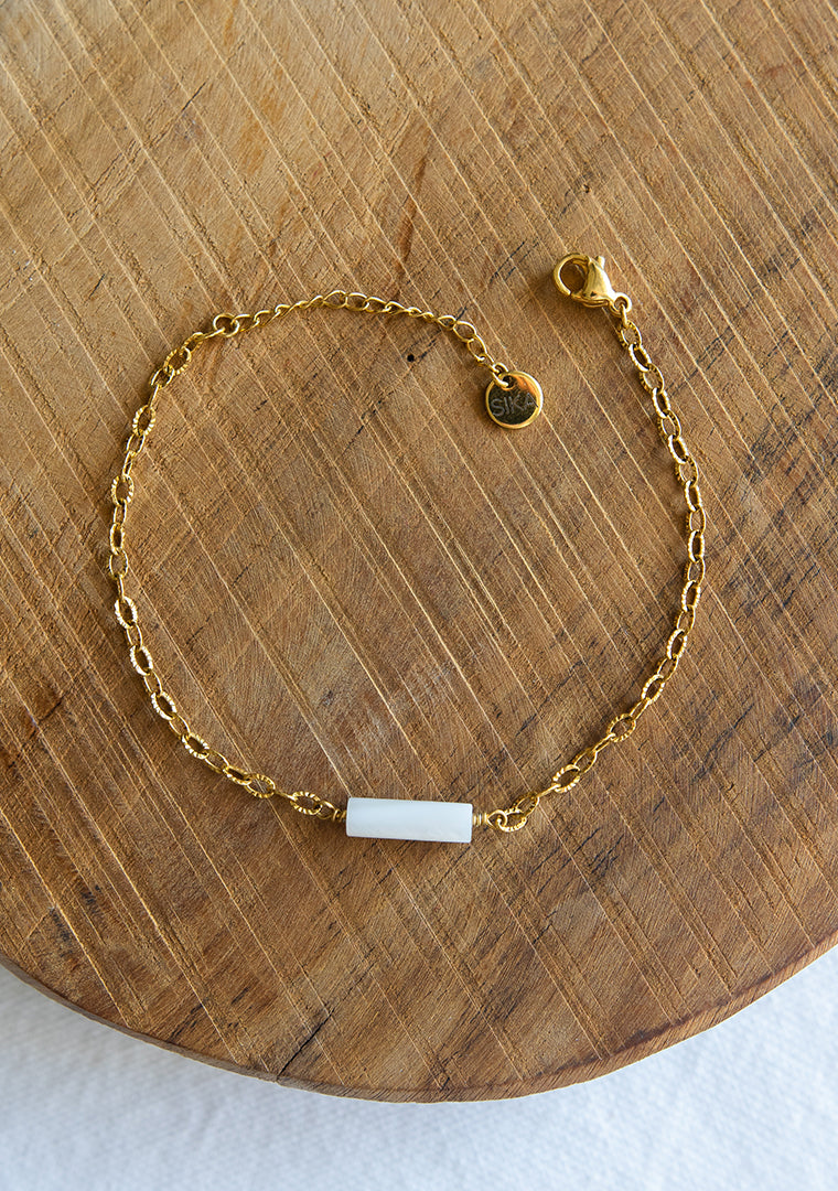 Le Bracelet Isa est fabriqué à la main dans mon atelier, Il est monté sur une chaine aux maillons ovales striés et décoré d’une perle en coquillage,