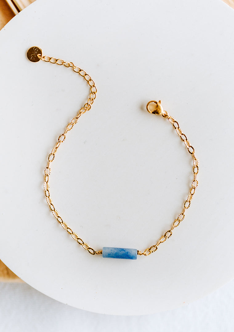 Le bracelet Isa est fabriqué à la main dans mon atelier, Il est composé d’une chaine aux maillons ovales striés ainsi que d’une Lépidolite bleue,