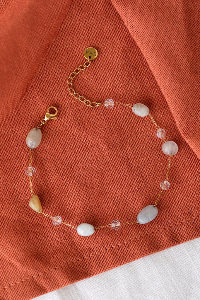 Le bracelet Lucie est fabriqué à la main dans mon atelier, Il est composé d’une fine chaîne aux maillons ovales et décoré de perles en Aigue-Marine et de perles de verre,