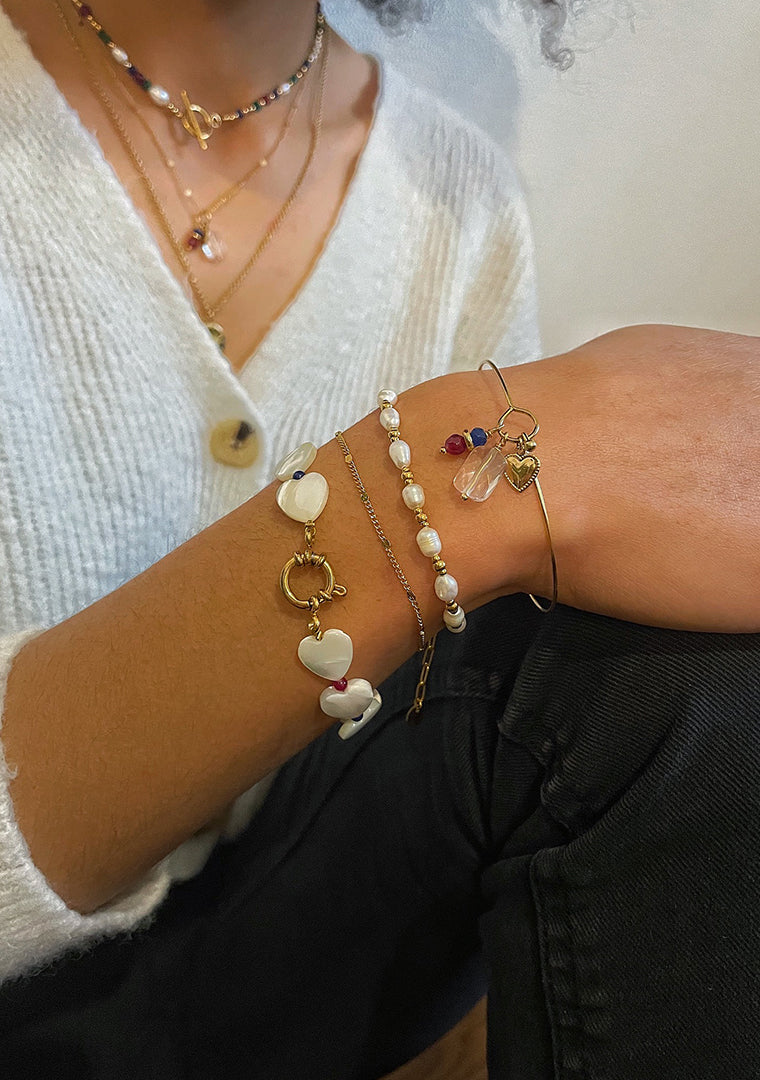Le bracelet Nour est fabriqué à la main dans mon atelier, Il est composé de perles d’eau douce et ainsi d’une chaine de rallonge aux maillons rectangulaires,