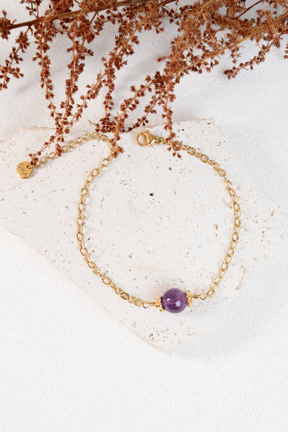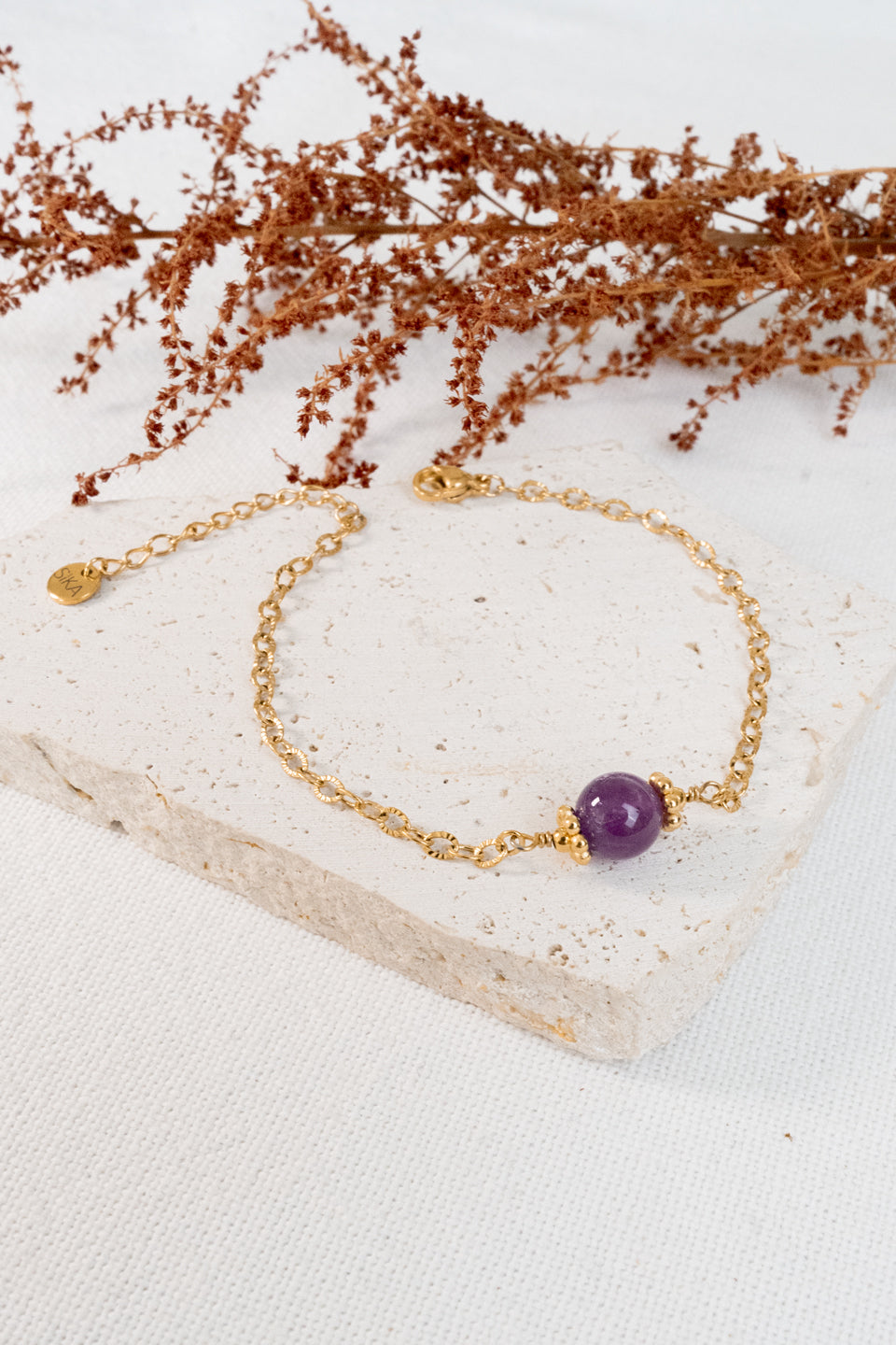 Le bracelet Osiris est fabriqué à la main dans mon atelier, Il est composé d’une fine chaines aux maillons ovales et striés, décoré de quelques perles dorées ainsi que d’une Améthyste,