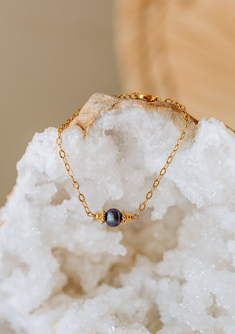 Le bracelet Osiris est fabriqué à la main dans mon atelier, Il est composé d’une fine chaines aux maillons ovales et striés, décoré de quelques perles dorées ainsi que d’une Perle d’eau douce grise,