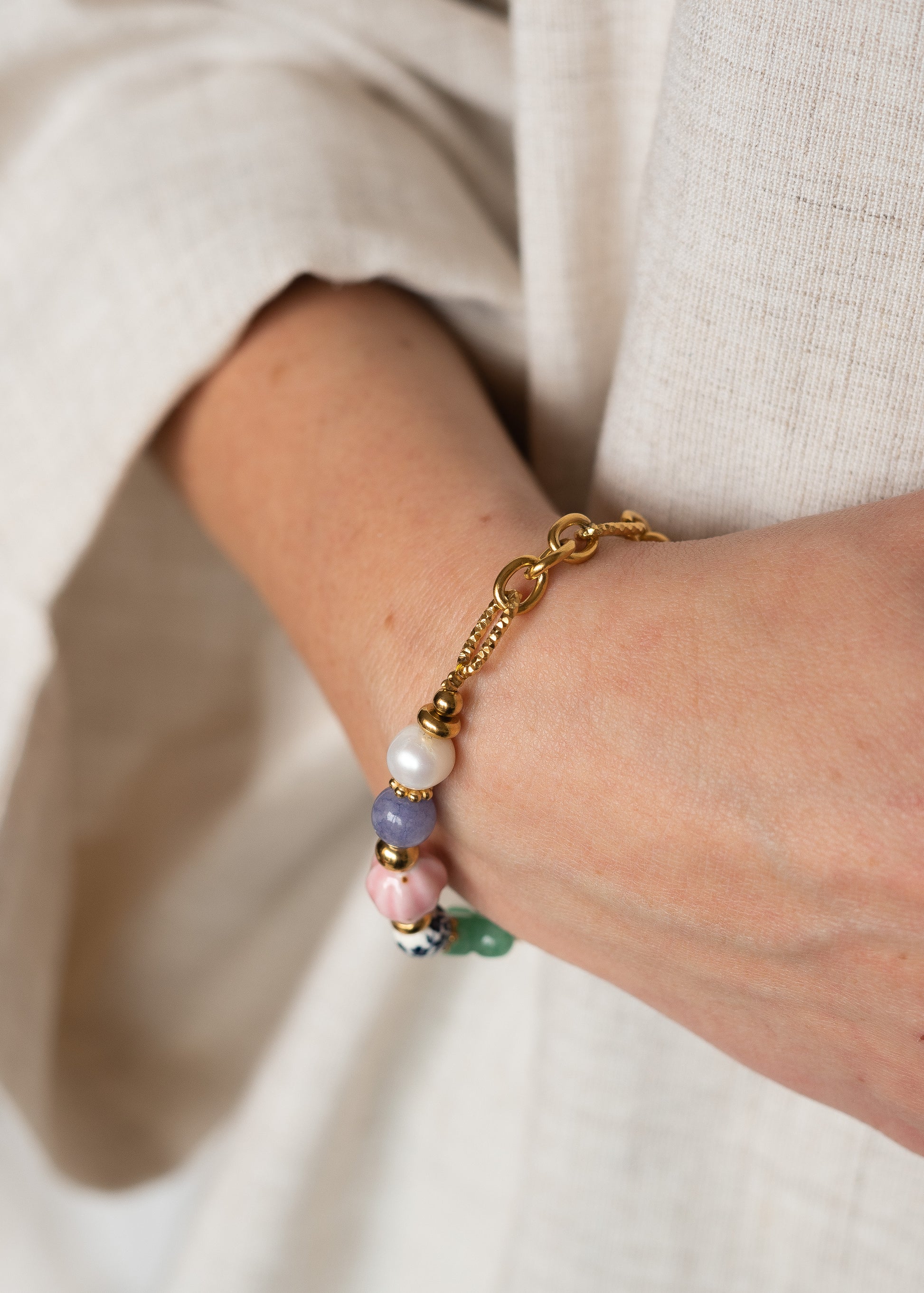 Le bracelet Renaissance est fabriqué à la main dans mon atelier, Il est composé d’une chaîne aux maillons asymétriques et striés, d’un fermoir marin, ainsi que d’une multitude de perles et de perles dorées,