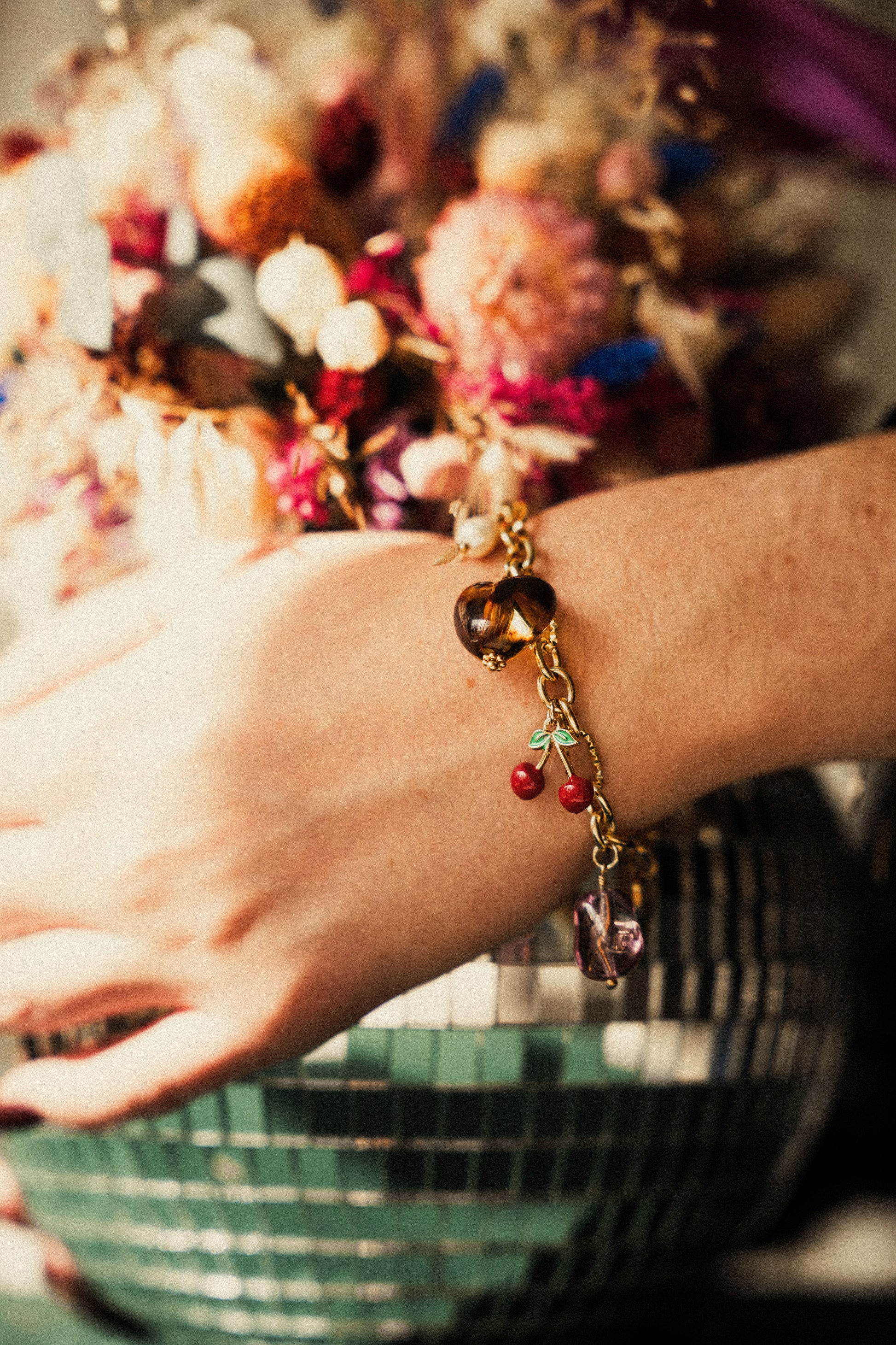 Le bracelet Romanza est fabriqué à la main dans mon atelier. Il est composé d’une chaine aux maillons asymétriques, d'une multitude de pampilles dorées, émaillées et de perles en verre, résine et en pierres semi précieuses. Il est également décoré d'un fermoir marin.