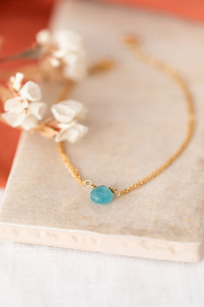 Le bracelet Romy est fabriqué à la main dans mon atelier, Il est composé d’une fine chaîne aux maillons ovales et d’une Jade teintée bleue,
