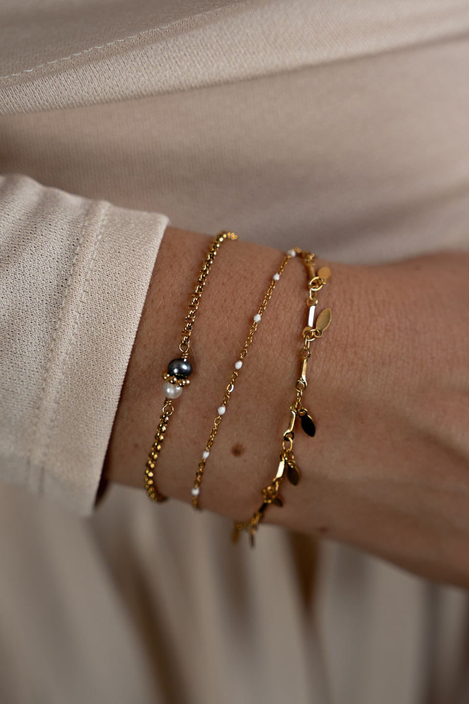 Le bracelet Tisha est fabriqué à la main dans mon atelier, Il est composé d’une chaine aux maillons ronds ainsi que de Perle d’eau douce blanche et grise,