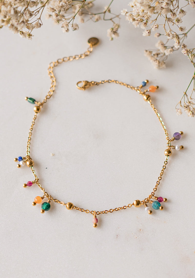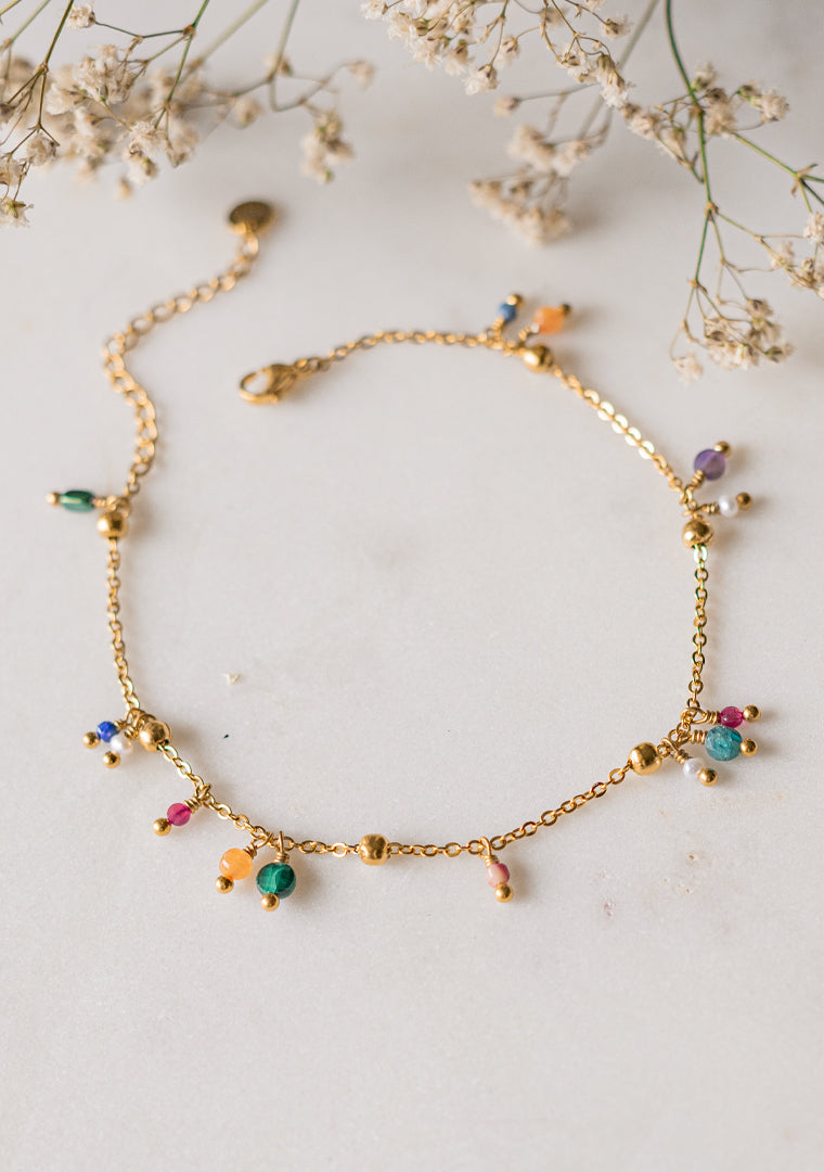 La chaine de cheville Aurore est fabriquée à la main dans mon atelier, Elle est montée sur une fine chaine ornée de billes dorée et d’une rivière de pampilles décorée de pierres semi-précieuses,