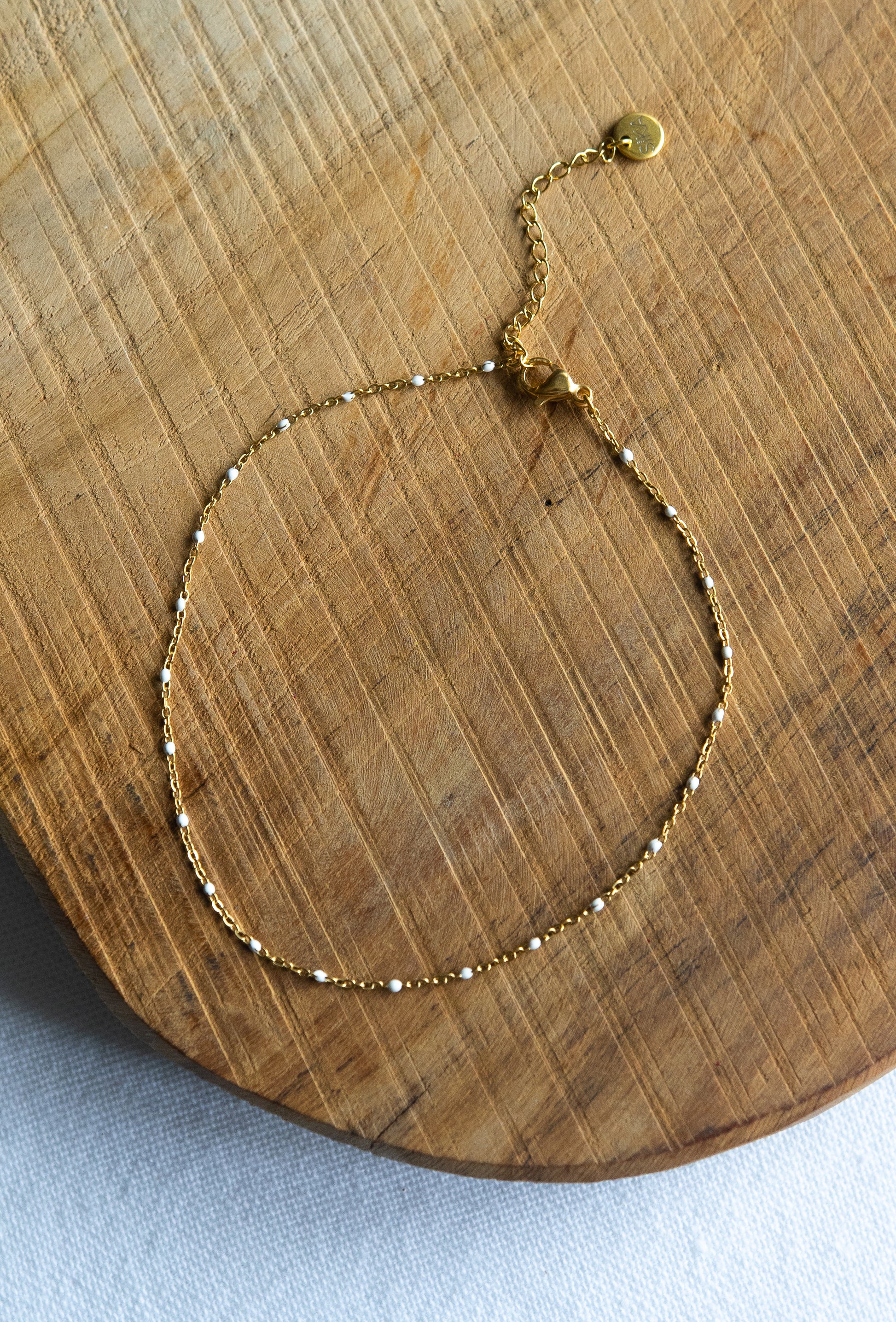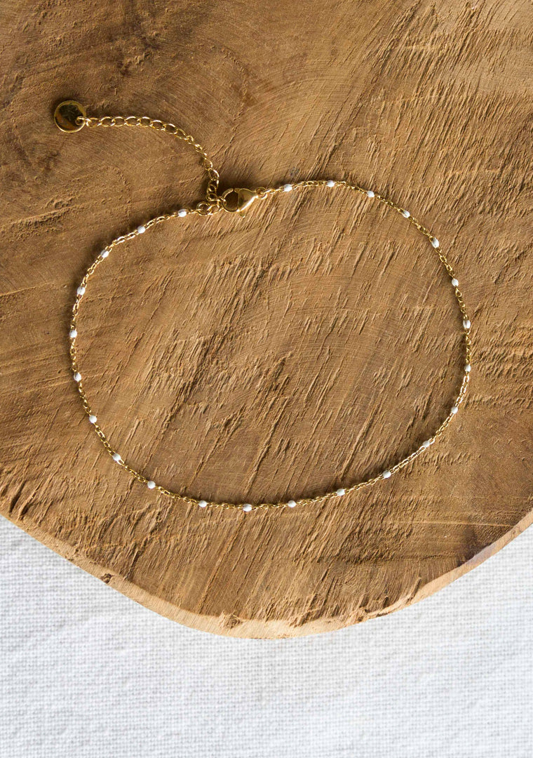 La chaine de cheville Erica est fabriqué à la main dans mon atelier, Elle est composée d’une fine chaine émaillée en blanc,
