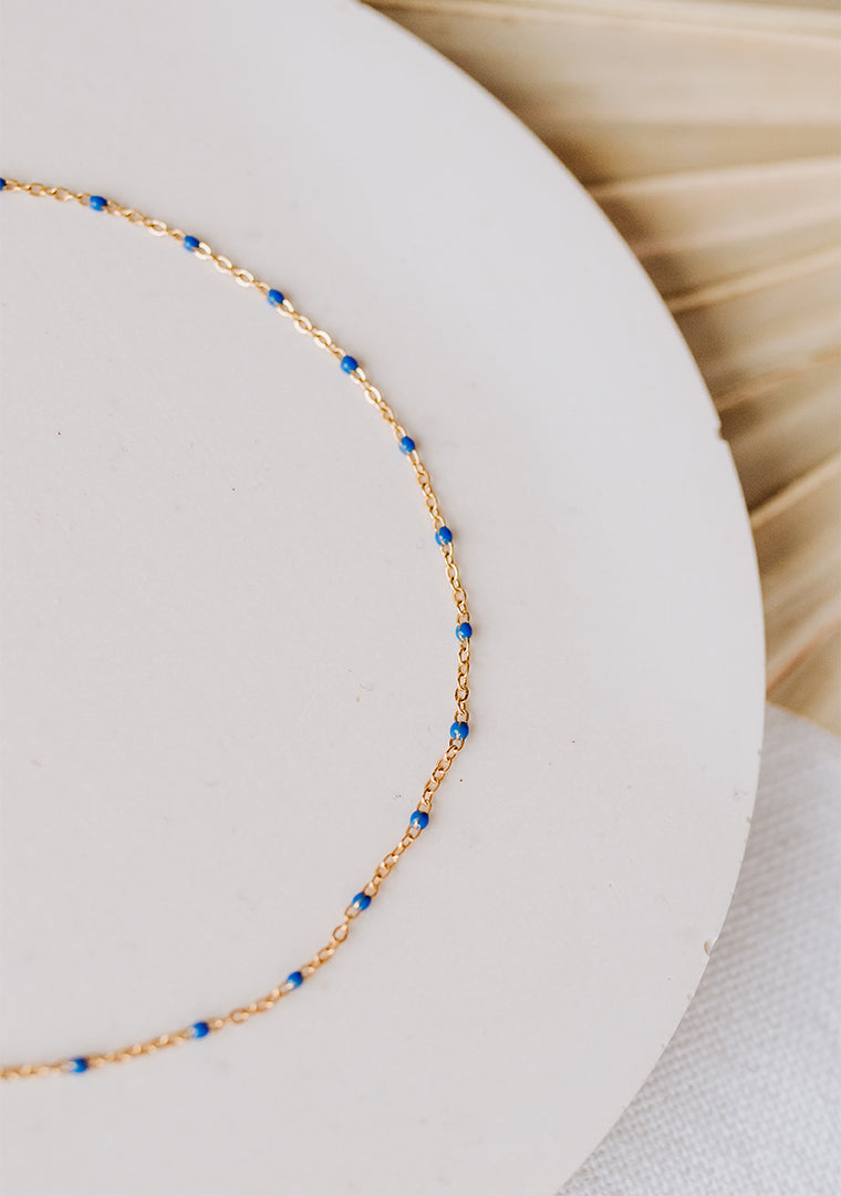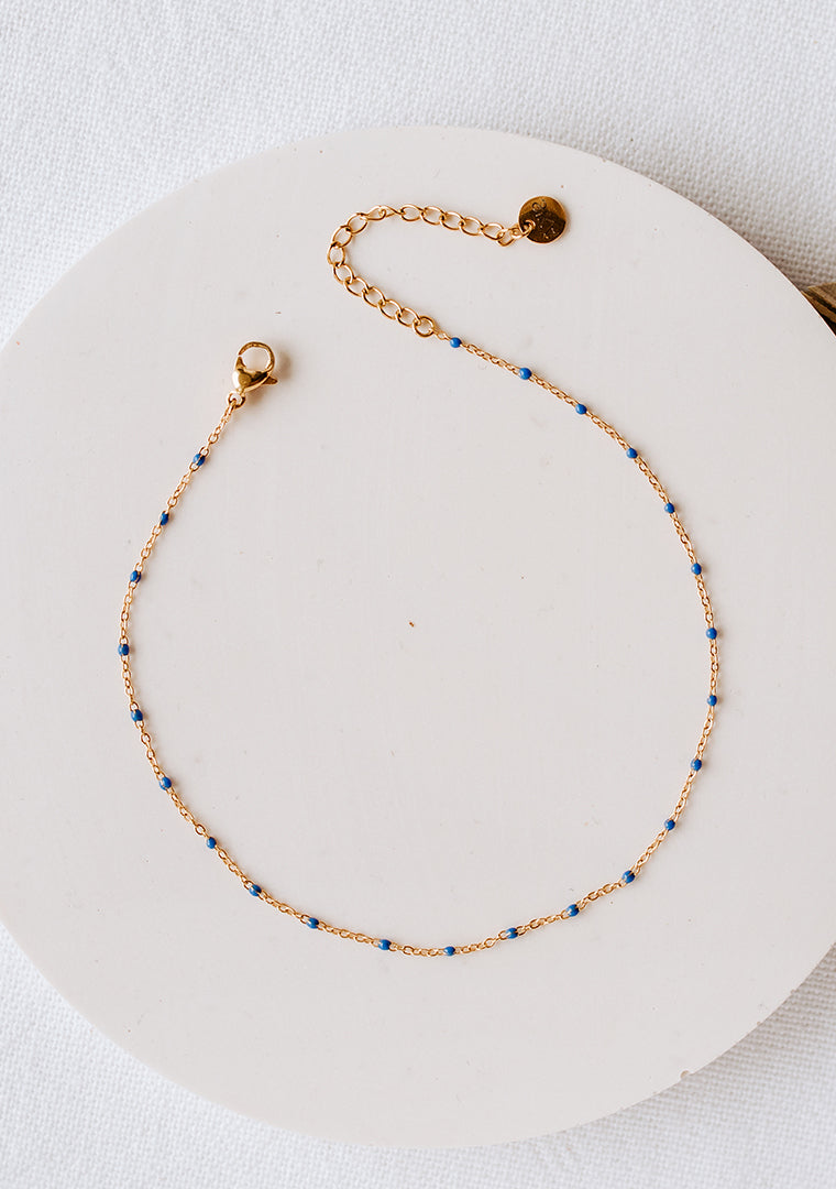 La chaîne de cheville Erica est fabriquée à la main dans mon atelier, Elle est composée d’une fine chaîne aux maillons émaillés en bleu,