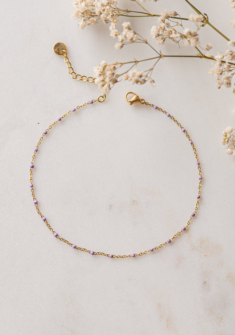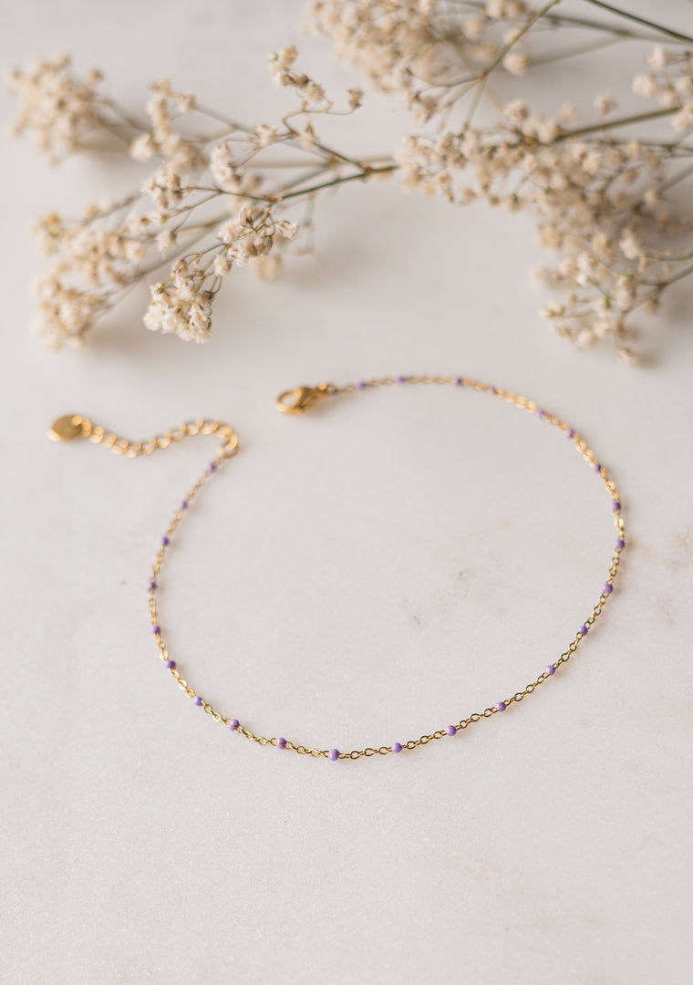 La chaîne de cheville Erica est fabriquée à la main dans mon atelier, Elle est composée d’une fine chaîne aux maillons émaillés de couleur lila,