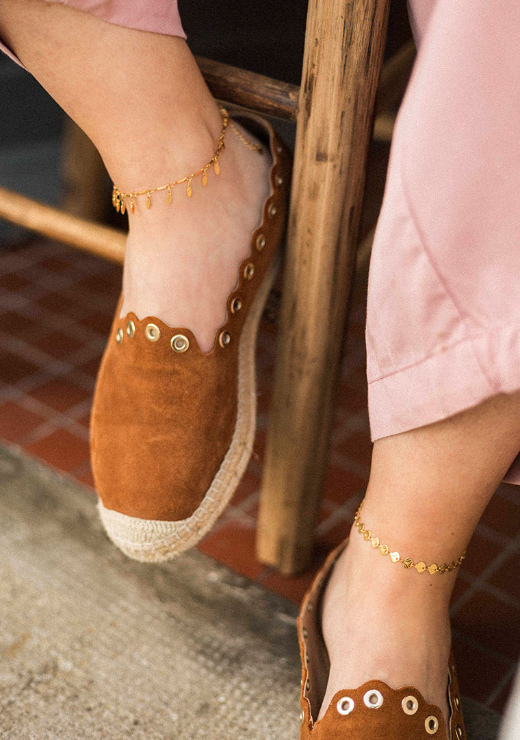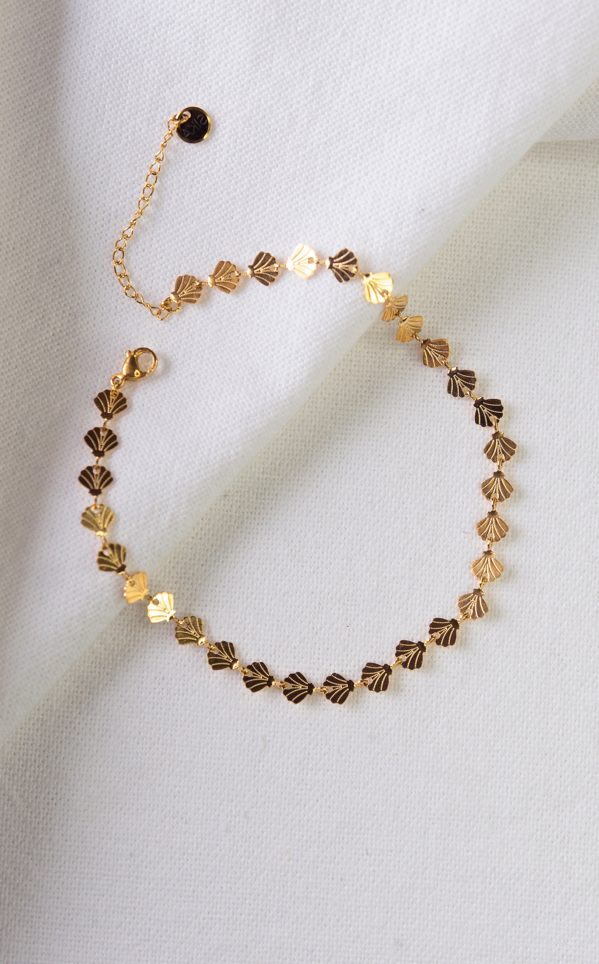 La chaine de cheville Marina est fabriquée à la main dans mon atelier, Elle est composée d’une chaine décorée d’un motif de coquillages,