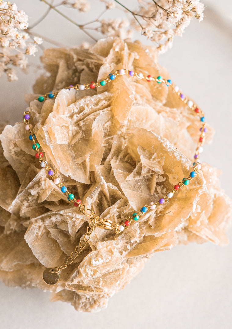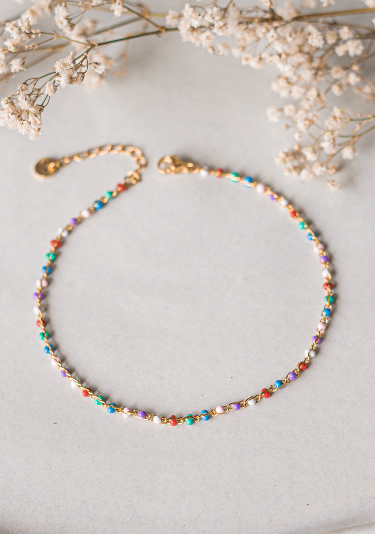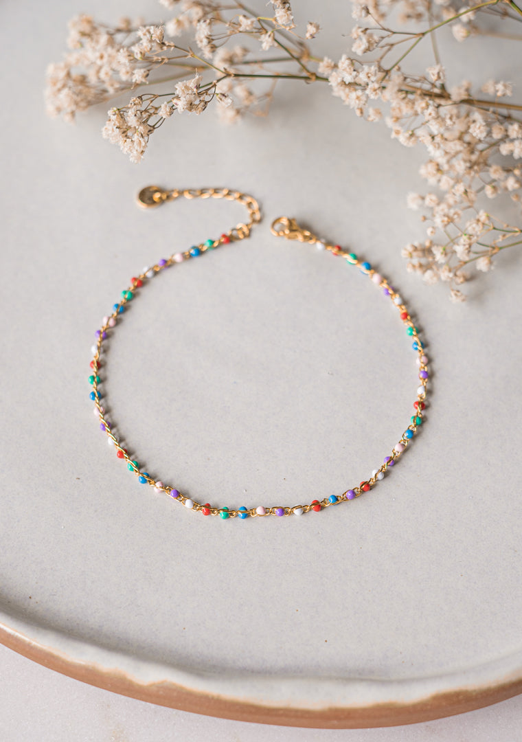 La chaine de cheville Poppy est fabriqué à la main dans mon atelier, Elle est composée d’une fine chaîne aux maillons émaillés de couleurs différentes,