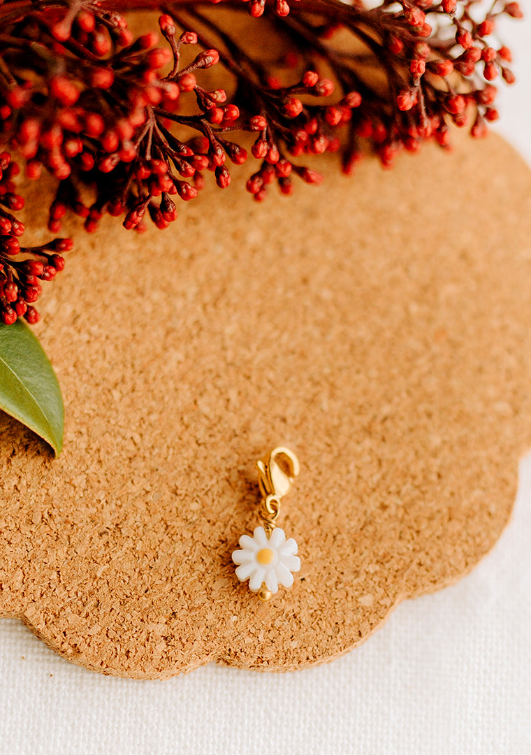 Le clip Marguerite est fabriqué à la main dans mon atelier, Il est composé d’un fermoir mousqueton et d’une Marguerite taillée dans un coquillage,