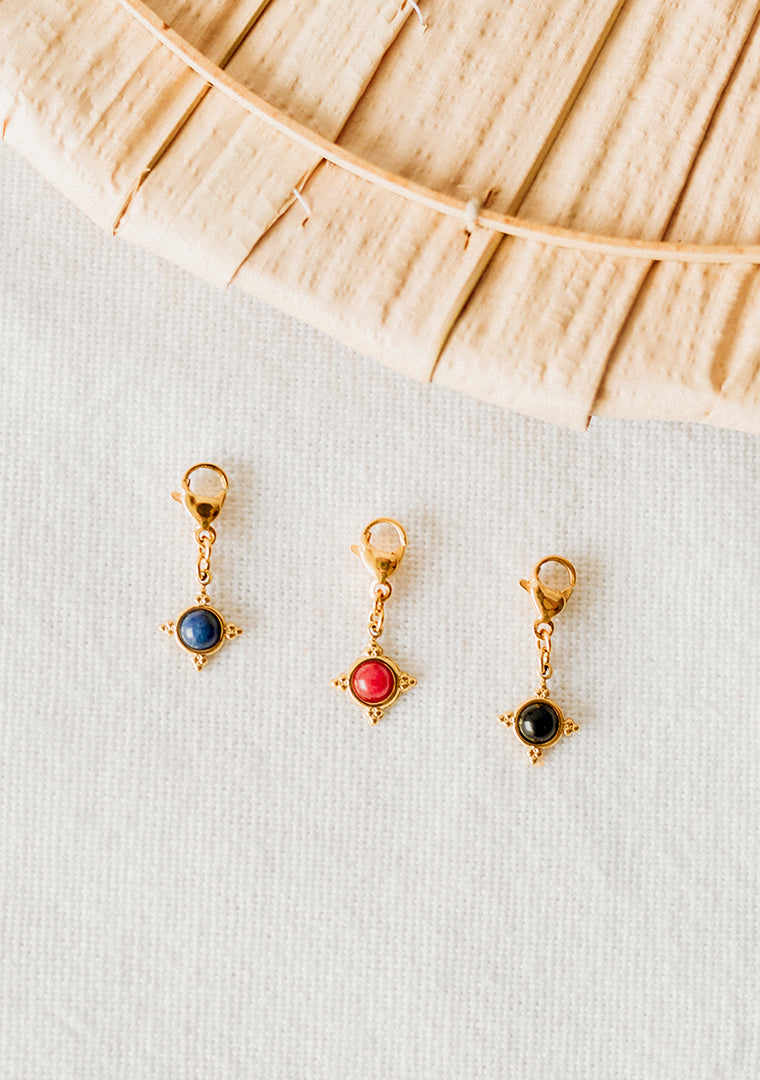 Les clips Lucie sont fabriqués à la main dans mon atelier, Il sont composés d’un fermoir mousqueton et d’une médaille dorée sertie d’une pierre dont la couleur est au choix :