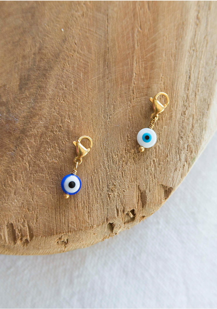 Les clips Oja sont fabriqués à la main dans mon atelier, Ils sont composés d’un fermoir mousqueton et d’un pendent orné d’un oeil en verre dont la couleur est au choix,