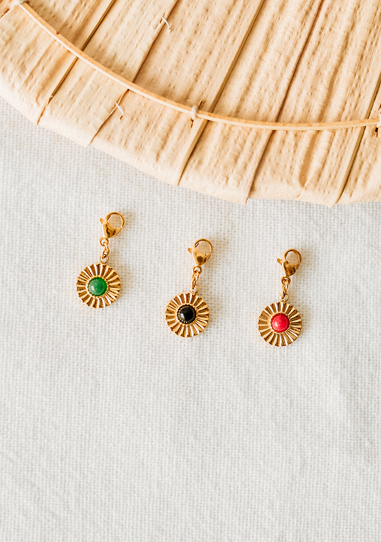 Les clips Sol sont fabriqués à la main dans mon atelier, Il sont composés d’un fermoir mousqueton et d’une médaille dorée sertie d’une pierre dont la couleur est au choix :
