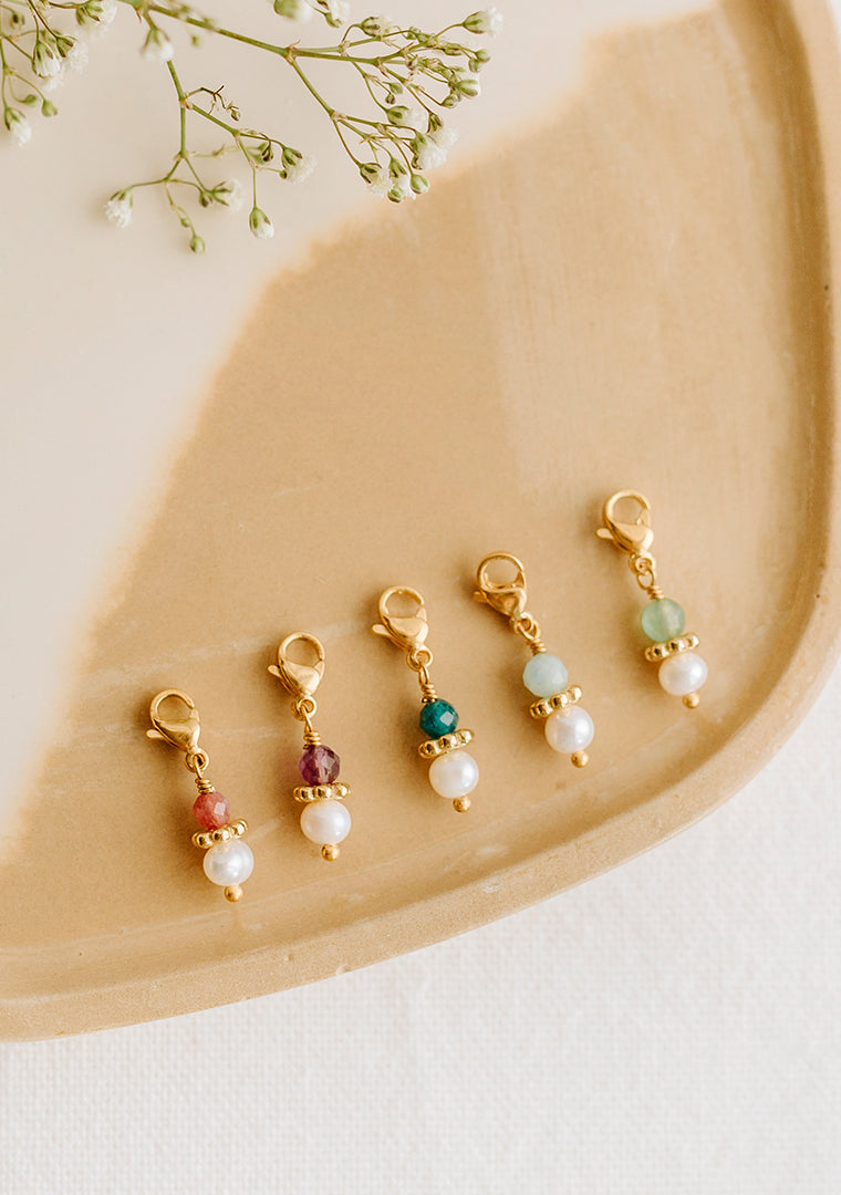 - Pierres : Agathe noire, Perle d’eau douce, Grenat & Jade teintée