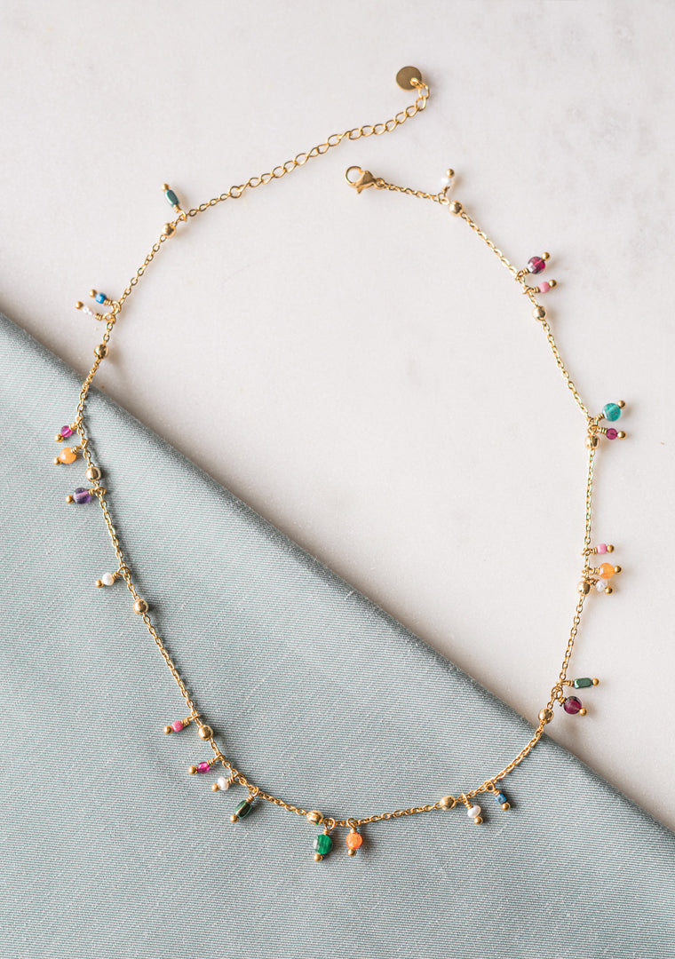 Le collier Aurore est fabriqué à la main dans mon atelier, Il est monté sur une fine chaine ornée de billes dorée et d’une rivière de pampilles décorée de pierres semi-précieuses,