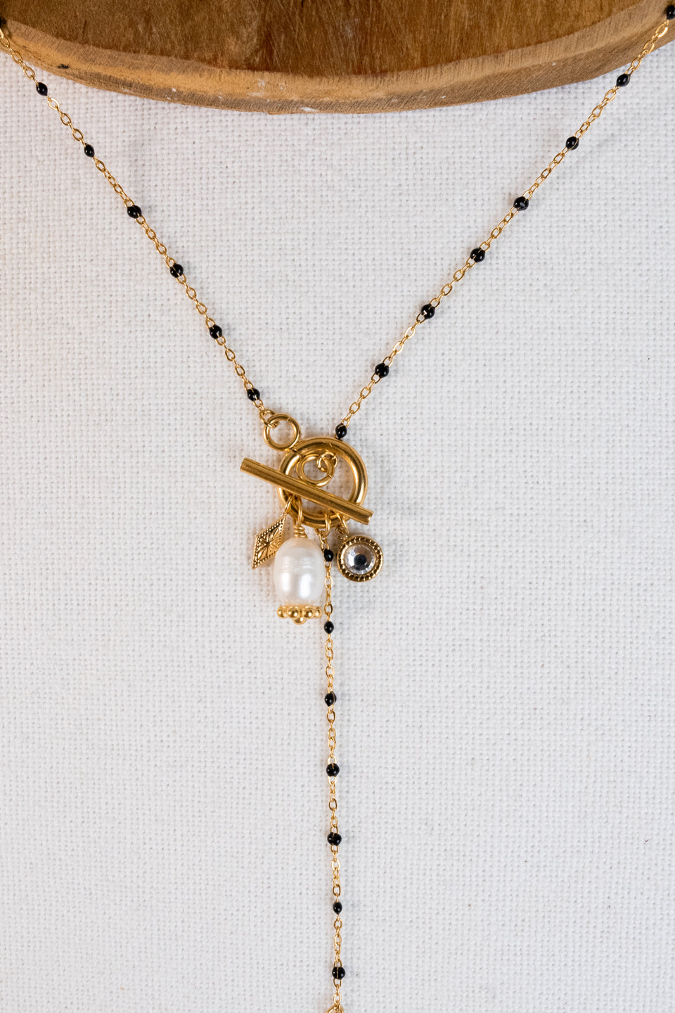 Le collier Ava est fabriqué à la main dans mon atelier, Il est monté sur une chaine aux maillons émaillés en noir, habillée d’un fermoir bâton décoré de pampilles composées d’une Perle d’eau douce, d’une médaille ronde striée et d’un strass, Le collier est également orné d’une chaine pendante habillée d’une médaille striée en forme de goutte,