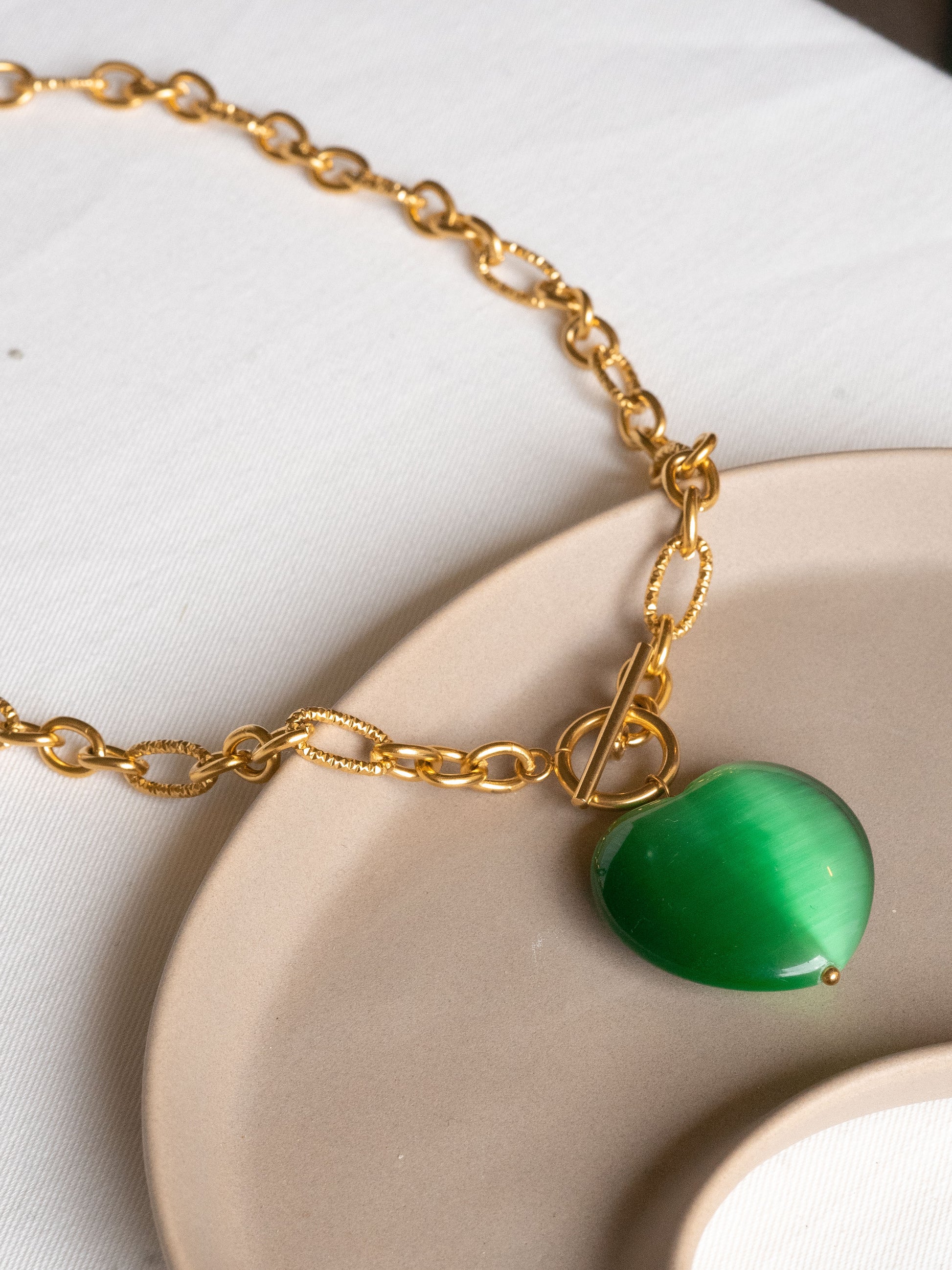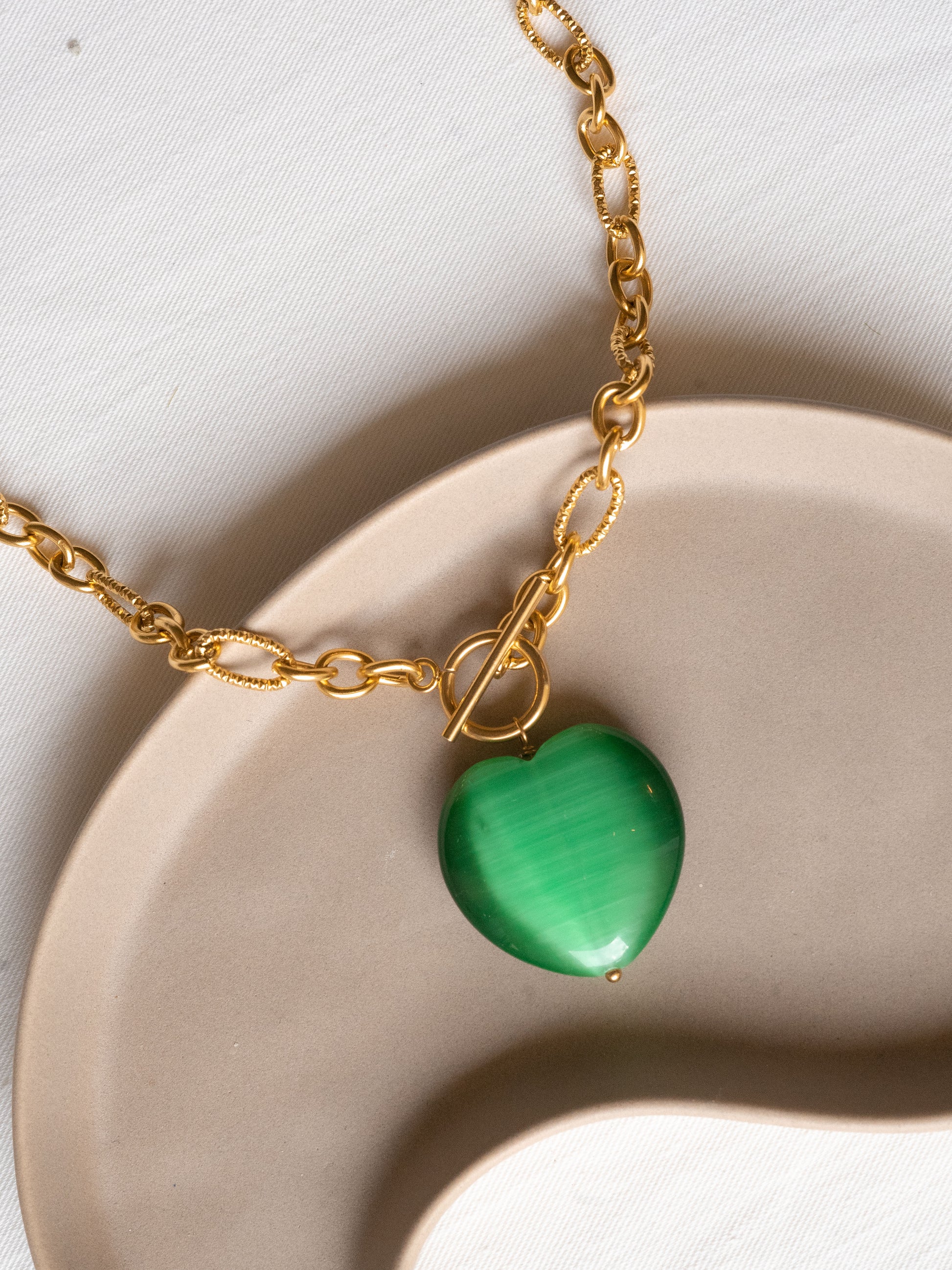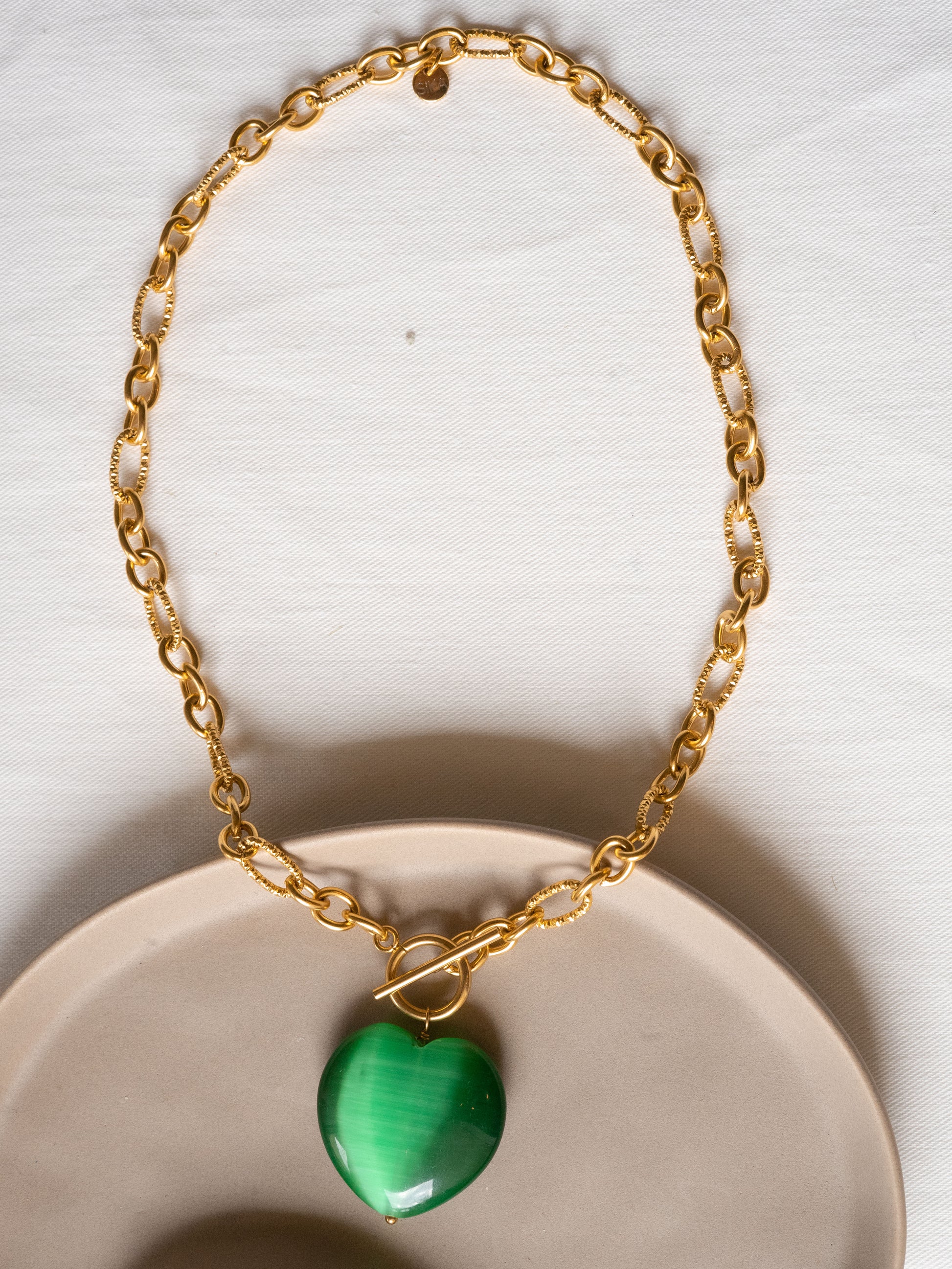 Le collier Béryl est fabriqué à la main dans mon atelier. Il est composé d’une chaine aux maillons asymétriques et est orné d'un fermoir barre décoré d'un pendentif en forme de coeur, en oeil de chat vert, aux multiples reflets.